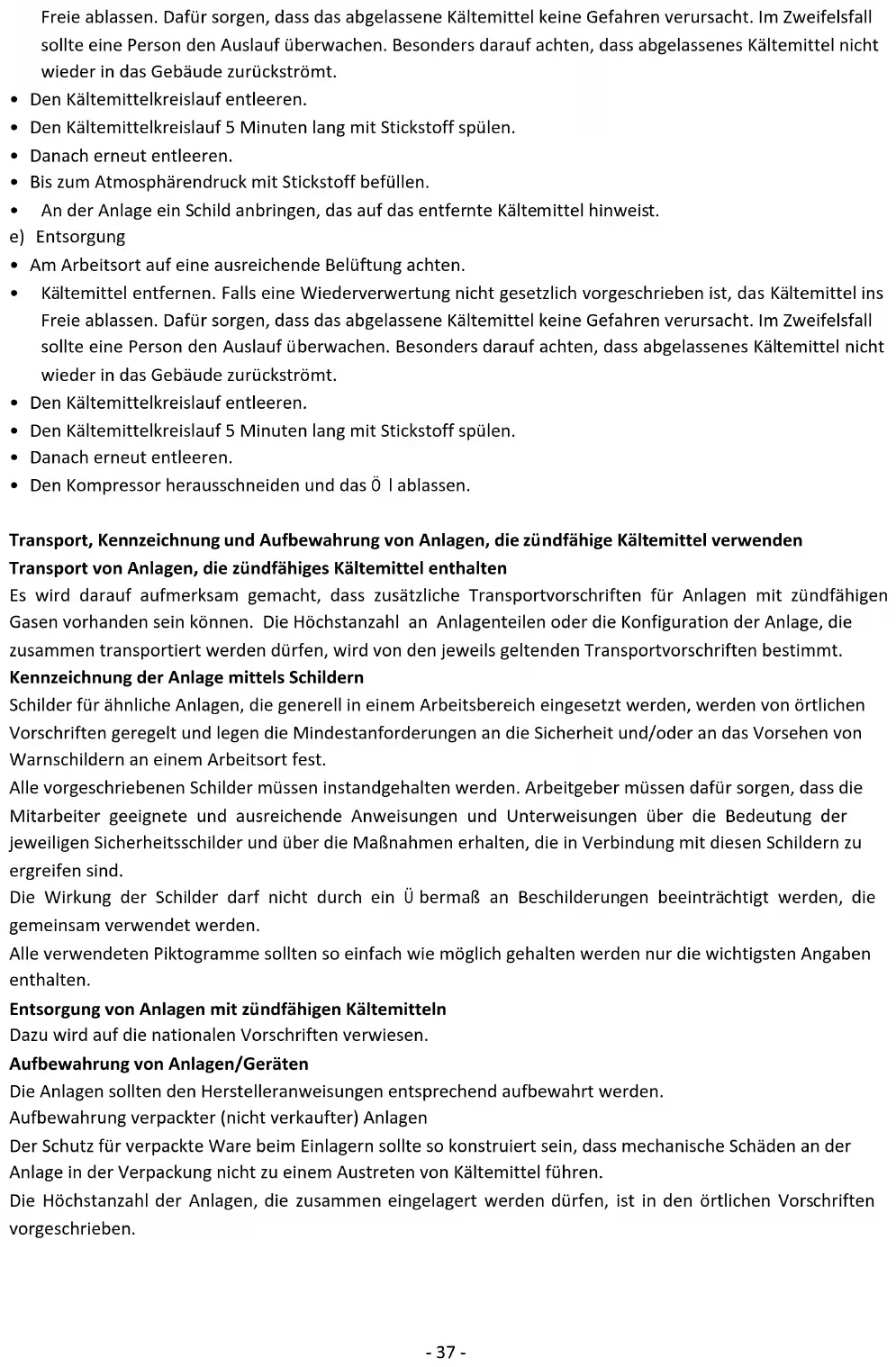 - Ouvrez le circuit en coupant ou en brasant. La charge de réfrigérant doit être récupérée dans les bouteilles de récupération adaptées. Le système doit être « vidé » avec de l’azote sans oxygène pour rendre l'unité sûre. Ce processus peut avoir besoin d'être répété plusieurs fois. L'air comprimé ou l'oxygène ne doit pas être utilisé pour cette tâche. Le rinçage doit être réalisé en rompant le vide dans le système avec de l’azote sans oxygène et en continuant à le verser jusqu’à atteindre la pression de fonctionnement, puis en le relâchant dans l’atmosphère et en le tirant finalement vers le vide. Ce processus doit être répété jusqu'à ce qu'il n'y ait plus de réfrigérant dans le système. Lorsque la dernière charge d’azote sans oxygène est utilisée, le système doit être purgé à la pression atmosphérique pour permettre le travail. Cette opération est absolument essentielle pour que des opérations de brasage sur la tuyauterie aient lieu. Assurez-vous que la sortie de la pompe à vide ne se trouve pas à proximité de sources d'inflammation et qu'il existe une ventilation.- 52 -