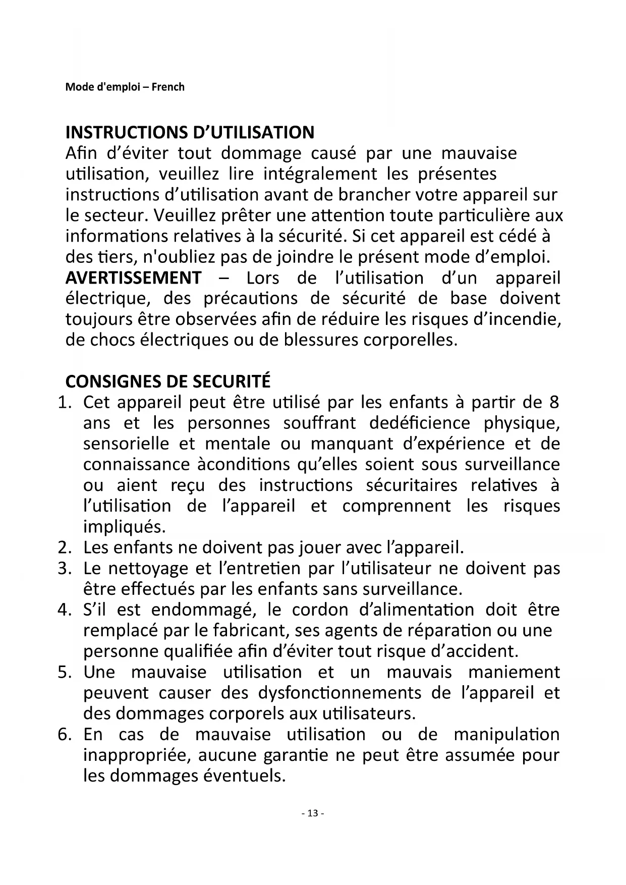 Afin d’éviter tout dommage causé par une mauvaise utilisation, veuillez lire intégralement les présentes instructions d’utilisation avant de brancher votre appareil sur le secteur. Veuillez prêter une attention toute particulière aux informations relatives à la sécurité. Si cet appareil est cédé à des tiers, n'oubliez pas de joindre le présent mode d’emploi. AVERTISSEMENT – Lors de l’utilisation d’un appareil électrique, des précautions de sécurité de base doivent toujours être observées afin de réduire les risques d’incendie, de chocs électriques ou de blessures corporelles.