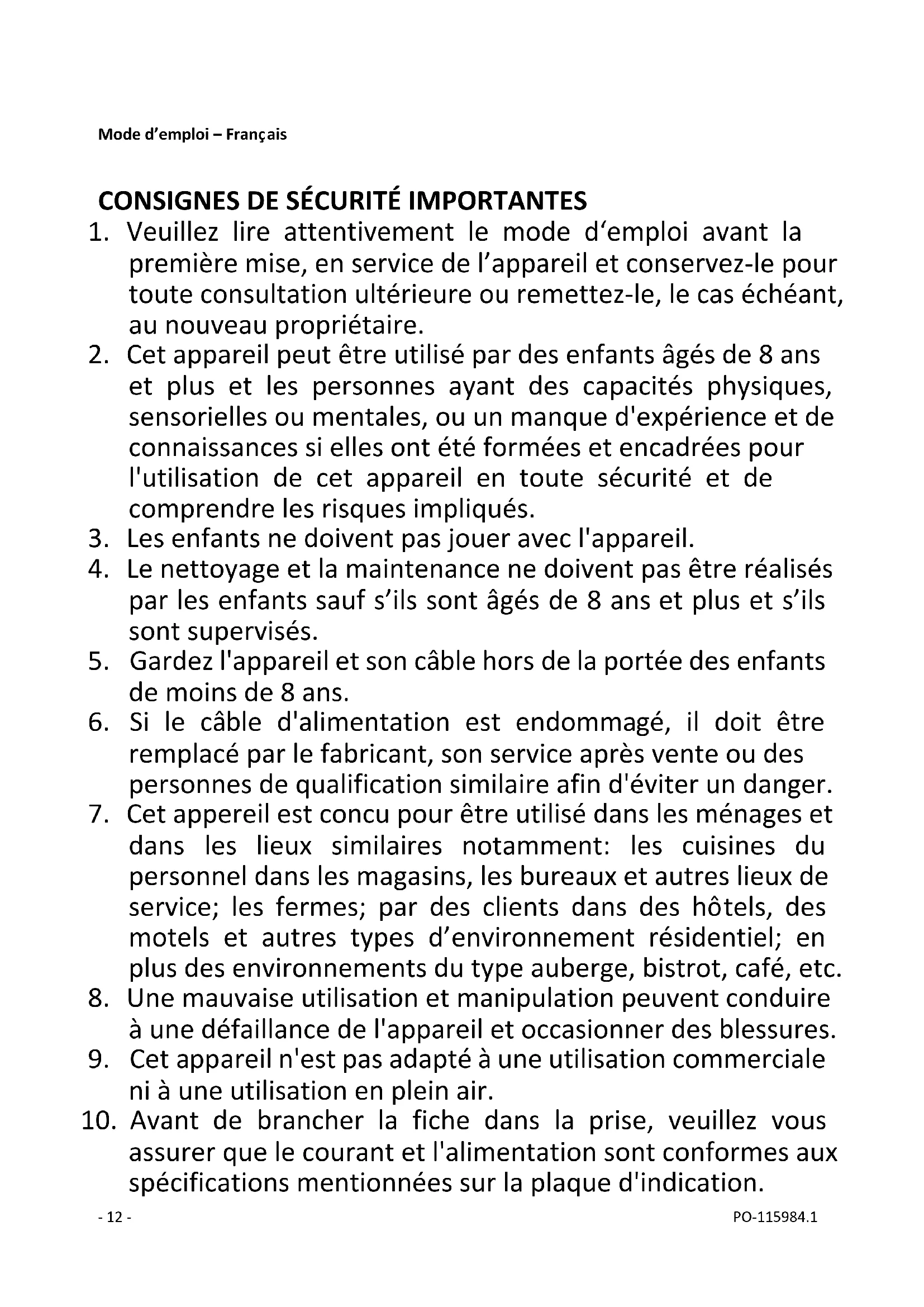 9. Cet appareil n'est pas adapté à une utilisation commerciale