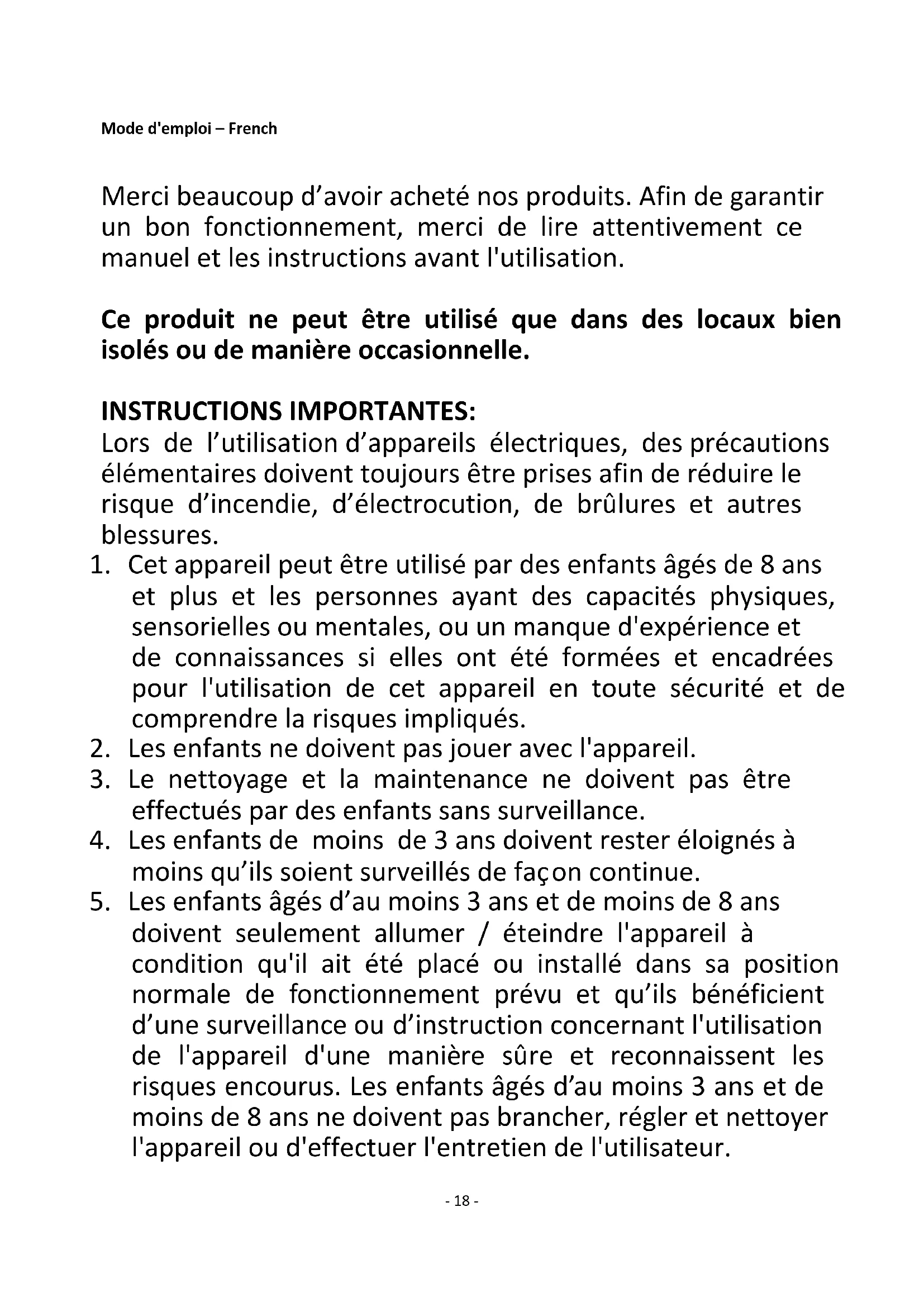 doivent seulement allumer / éteindre l'appareil à condition qu'il ait été placé ou installé dans sa position normale de fonctionnement prévu et qu’ils bénéficient d’une surveillance ou d’instruction concernant l'utilisation de l'appareil d'une manière sûre et reconnaissent les risques encourus. Les enfants âgés d’au moins 3 ans et de moins de 8 ans ne doivent pas brancher, régler et nettoyer l'appareil ou d'effectuer l'entretien de l'utilisateur.- 19 -