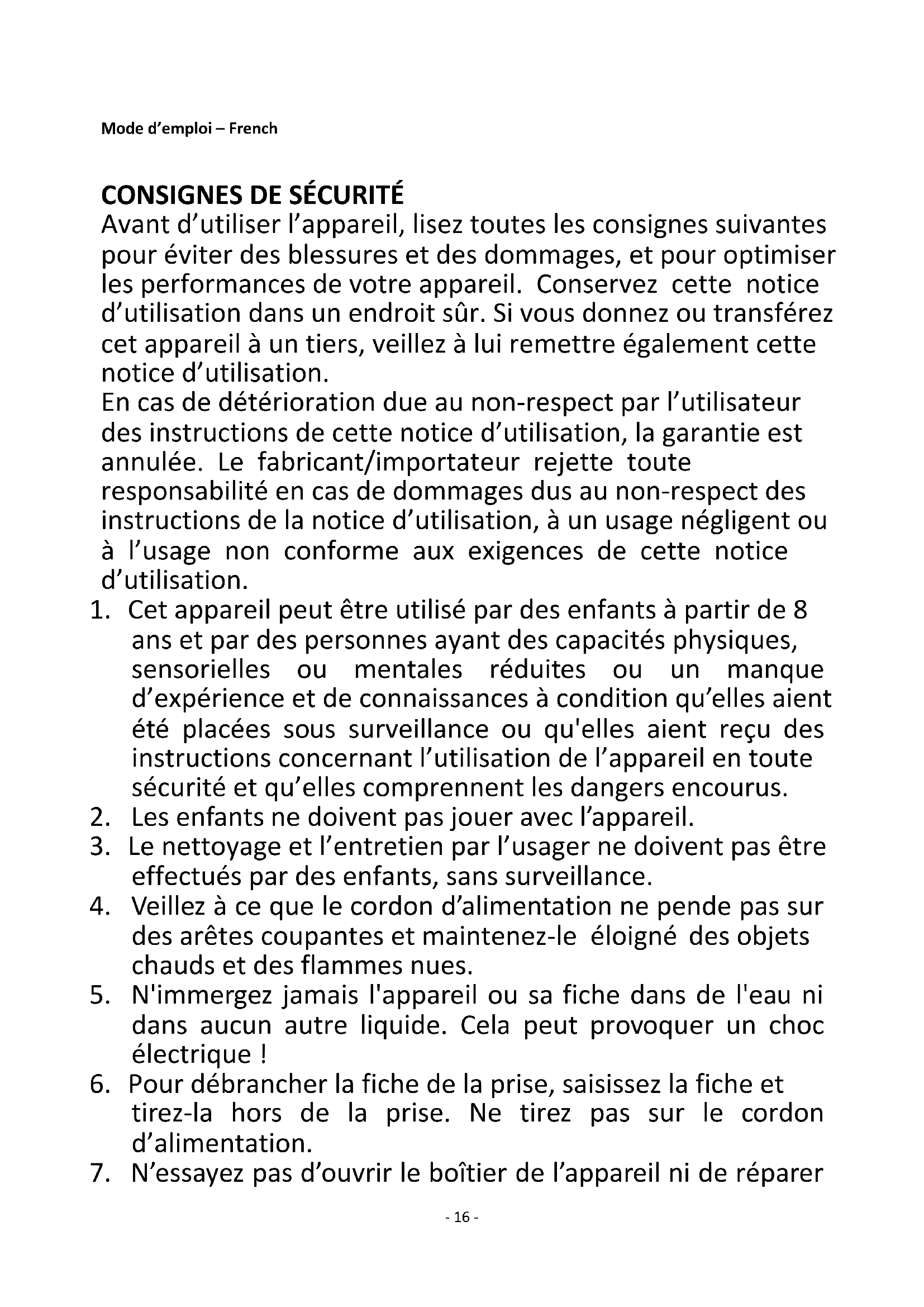 Avant d’utiliser l’appareil, lisez toutes les consignes suivantes pour éviter des blessures et des dommages, et pour optimiser les performances de votre appareil. Conservez cette notice d’utilisation dans un endroit sûr. Si vous donnez ou transférez cet appareil à un tiers, veillez à lui remettre également cette notice d’utilisation. En cas de détérioration due au non-respect par l’utilisateur des instructions de cette notice d’utilisation, la garantie est annulée. Le fabricant/importateur rejette toute responsabilité en cas de dommages dus au non-respect des instructions de la notice d’utilisation, à un usage négligent ou à l’usage non conforme aux exigences de cette notice d’utilisation.
