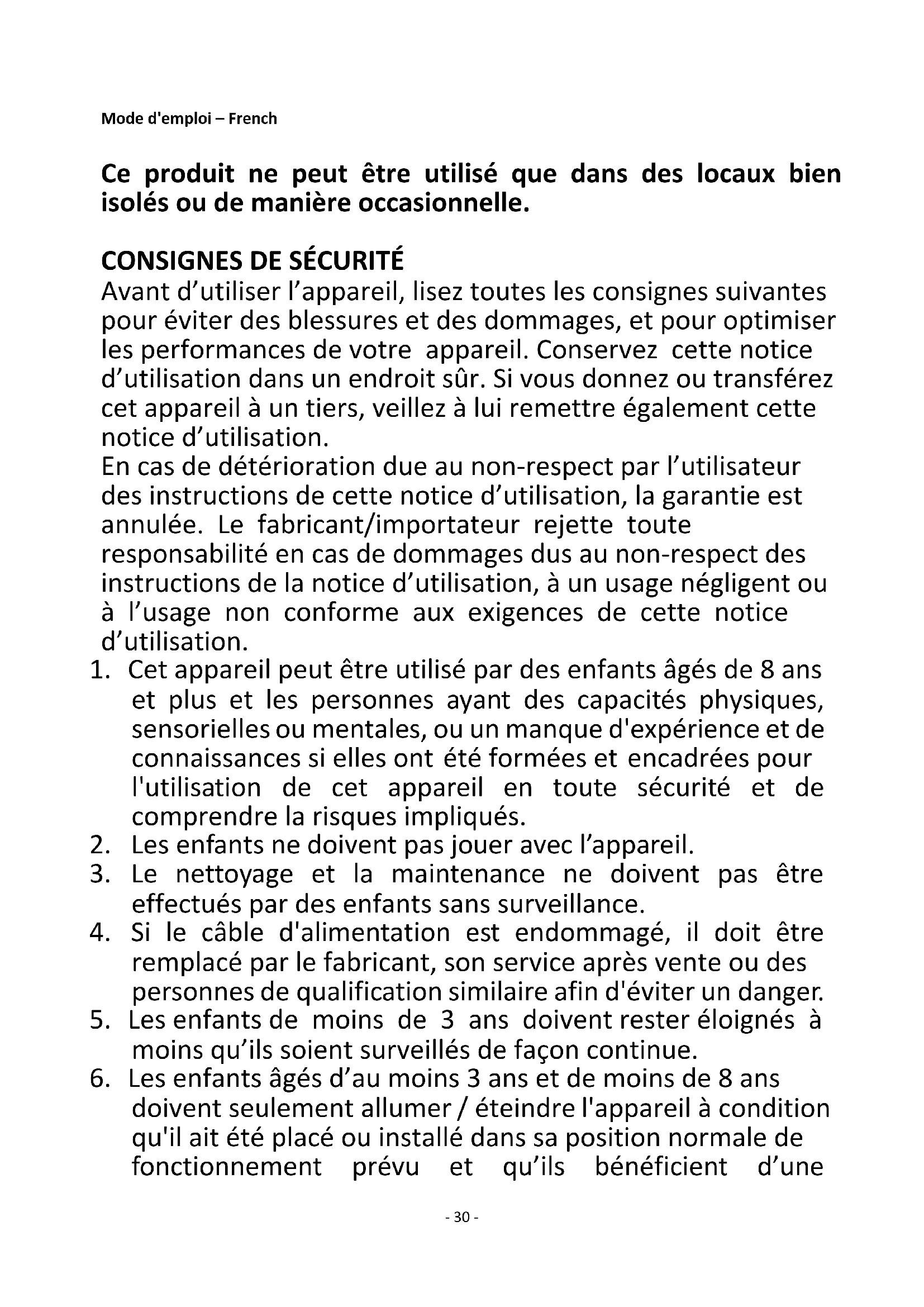 doivent seulement allumer / éteindre l'appareil à condition qu'il ait été placé ou installé dans sa position normale de fonctionnement prévu et qu’ils bénéficient d’une- 31 - surveillance ou d’instruction concernant l'utilisation de l'appareil d'une manière sûre et reconnaissent les risques encourus. Les enfants âgés d’au moins 3 ans et de moins de 8 ans ne doivent pas brancher, régler et nettoyer l'appareil ou d'effectuer l'entretien de l'utilisateur.