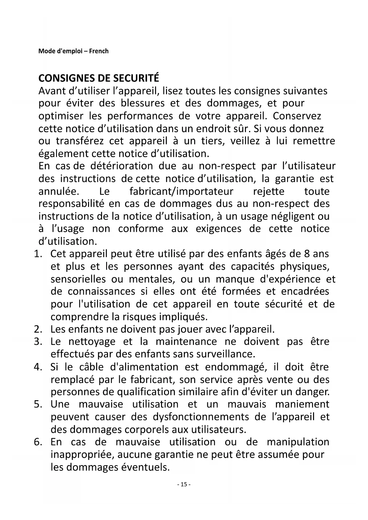 Avant d’utiliser l’appareil, lisez toutes les consignes suivantes pour éviter des blessures et des dommages, et pour optimiser les performances de votre appareil. Conservez cette notice d’utilisation dans un endroit sûr. Si vous donnez ou transférez cet appareil à un tiers, veillez à lui remettre également cette notice d’utilisation. En cas de détérioration due au non-respect par l’utilisateur des instructions de cette notice d’utilisation, la garantie est annulée. Le fabricant/importateur rejette toute responsabilité en cas de dommages dus au non-respect des instructions de la notice d’utilisation, à un usage négligent ou à l’usage non conforme aux exigences de cette notice d’utilisation.