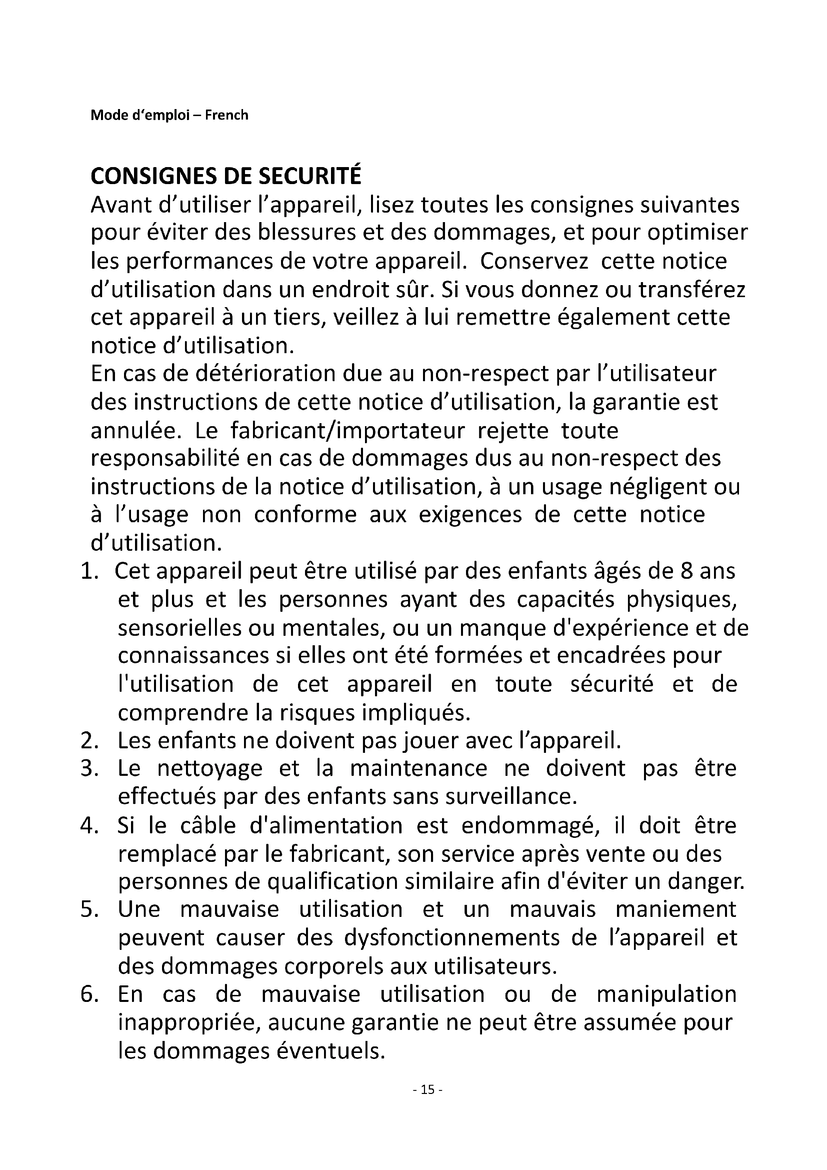 Avant d’utiliser l’appareil, lisez toutes les consignes suivantes pour éviter des blessures et des dommages, et pour optimiser les performances de votre appareil. Conservez cette notice d’utilisation dans un endroit sûr. Si vous donnez ou transférez cet appareil à un tiers, veillez à lui remettre également cette notice d’utilisation. En cas de détérioration due au non-respect par l’utilisateur des instructions de cette notice d’utilisation, la garantie est annulée. Le fabricant/importateur rejette toute responsabilité en cas de dommages dus au non-respect des instructions de la notice d’utilisation, à un usage négligent ou à l’usage non conforme aux exigences de cette notice d’utilisation.