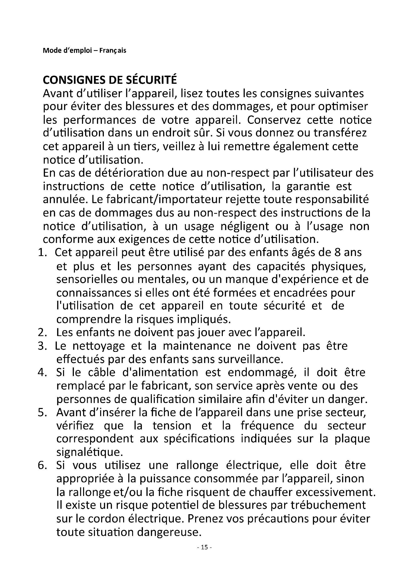 Avant d’utiliser l’appareil, lisez toutes les consignes suivantes pour éviter des blessures et des dommages, et pour optimiser les performances de votre appareil. Conservez cette notice d’utilisation dans un endroit sûr. Si vous donnez ou transférez cet appareil à un tiers, veillez à lui remettre également cette notice d’utilisation. En cas de détérioration due au non-respect par l’utilisateur des instructions de cette notice d’utilisation, la garantie est annulée. Le fabricant/importateur rejette toute responsabilité en cas de dommages dus au non-respect des instructions de la notice d’utilisation, à un usage négligent ou à l’usage non conforme aux exigences de cette notice d’utilisation.