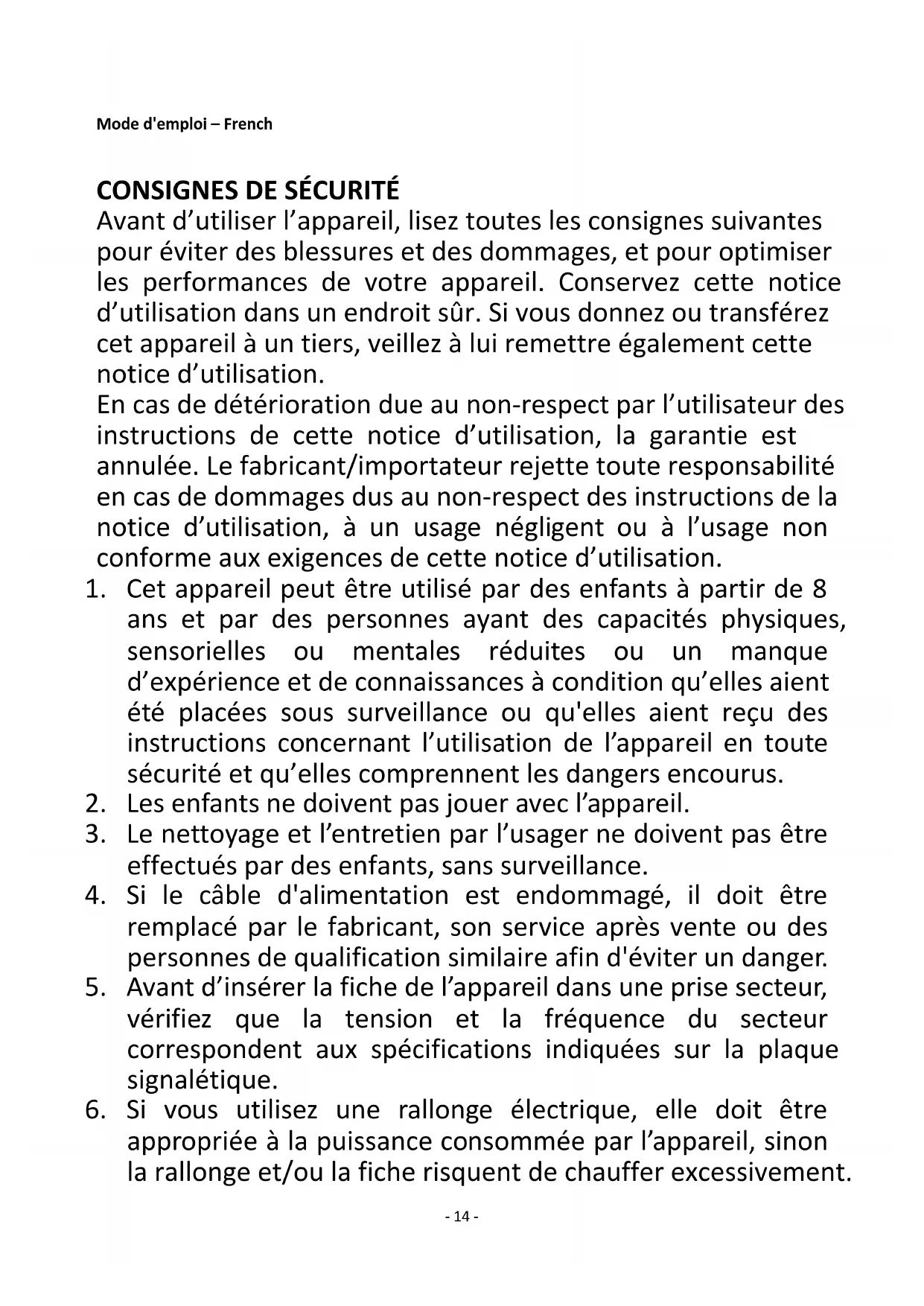 Avant d’utiliser l’appareil, lisez toutes les consignes suivantes pour éviter des blessures et des dommages, et pour optimiser les performances de votre appareil. Conservez cette notice d’utilisation dans un endroit sûr. Si vous donnez ou transférez cet appareil à un tiers, veillez à lui remettre également cette notice d’utilisation. En cas de détérioration due au non-respect par l’utilisateur des instructions de cette notice d’utilisation, la garantie est annulée. Le fabricant/importateur rejette toute responsabilité en cas de dommages dus au non-respect des instructions de la notice d’utilisation, à un usage négligent ou à l’usage non conforme aux exigences de cette notice d’utilisation.
