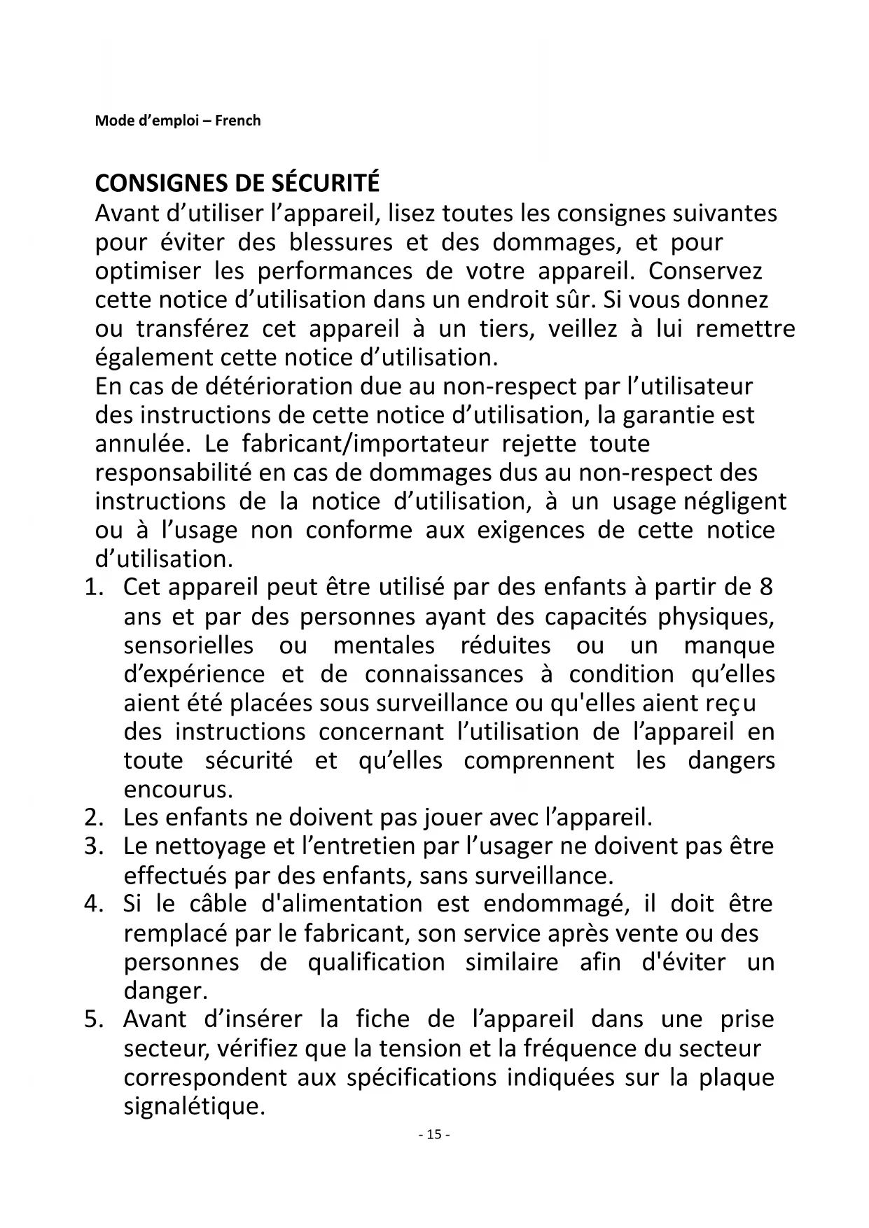 Avant d’utiliser l’appareil, lisez toutes les consignes suivantes pour éviter des blessures et des dommages, et pour optimiser les performances de votre appareil. Conservez cette notice d’utilisation dans un endroit sûr. Si vous donnez ou transférez cet appareil à un tiers, veillez à lui remettre également cette notice d’utilisation. En cas de détérioration due au non-respect par l’utilisateur des instructions de cette notice d’utilisation, la garantie est annulée. Le fabricant/importateur rejette toute responsabilité en cas de dommages dus au non-respect des instructions de la notice d’utilisation, à un usage négligent ou à l’usage non conforme aux exigences de cette notice d’utilisation.