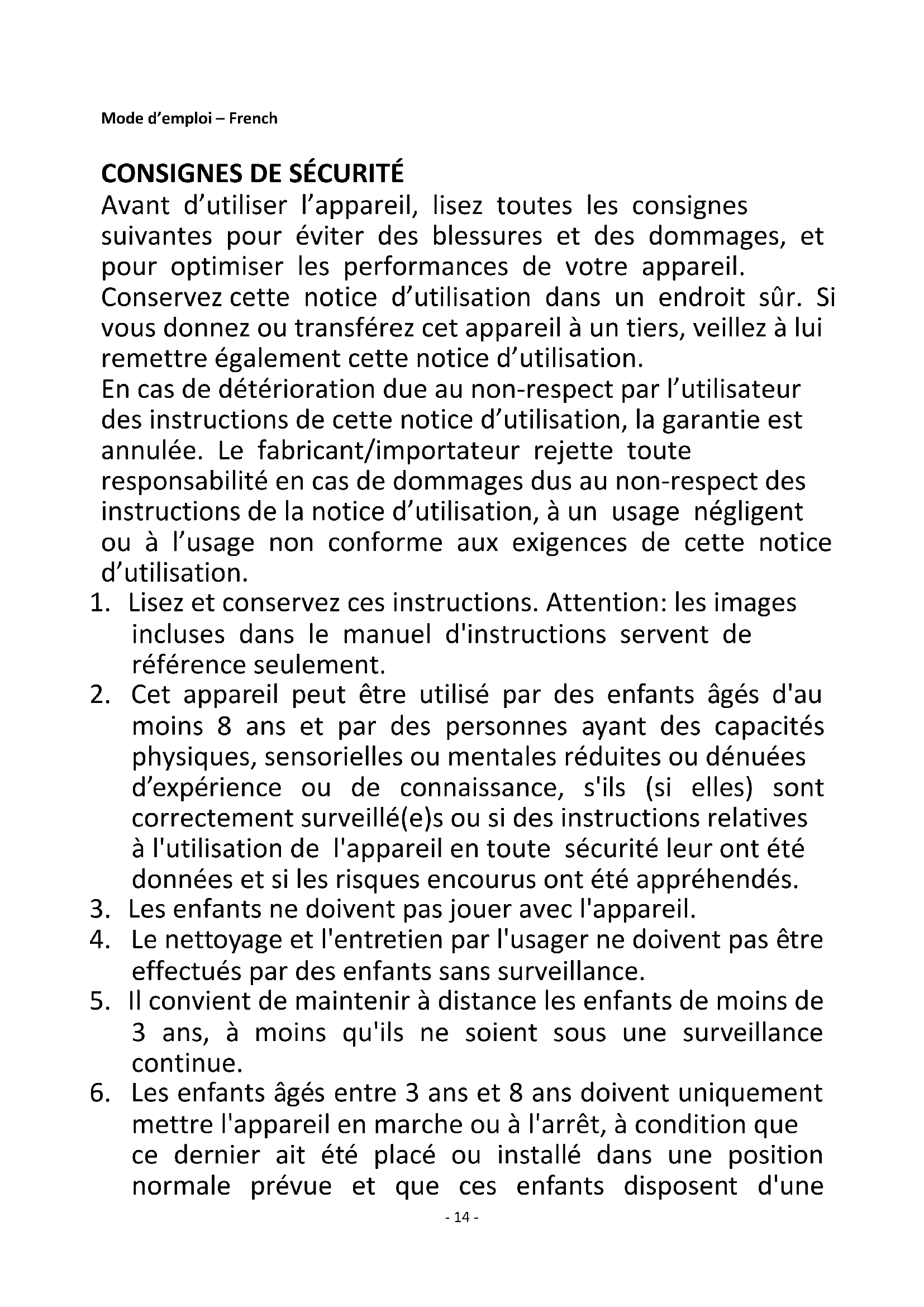 Avant d’utiliser l’appareil, lisez toutes les consignes suivantes pour éviter des blessures et des dommages, et pour optimiser les performances de votre appareil. Conservez cette notice d’utilisation dans un endroit sûr. Si vous donnez ou transférez cet appareil à un tiers, veillez à lui remettre également cette notice d’utilisation. En cas de détérioration due au non-respect par l’utilisateur des instructions de cette notice d’utilisation, la garantie est annulée. Le fabricant/importateur rejette toute responsabilité en cas de dommages dus au non-respect des instructions de la notice d’utilisation, à un usage négligent ou à l’usage non conforme aux exigences de cette notice d’utilisation.