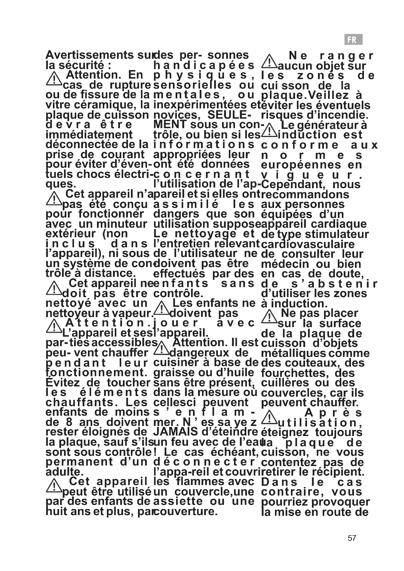 Avertissements sur la sécurité : Attention. En cas de rupture RXGH¿VVXUHGHOD vitre céramique, la plaque de cuisson d e v r a ê t r e immédiatement déconnectée de la prise de courant pour éviter d’éven- tuels chocs électri- ques. Cet appareil n’a pas été conçu pour fonctionner avec un minuteur extérieur (non i n c l u s d a n s l’appareil), ni sous un système de con- WU{OHjGLVWDQFH Cet appareil ne doit pas être nettoyé avec un QHWWR\HXUjYDSHXU A t t e n t i o n . L’appareil et ses par- ties accessibles SHXYHQWFKDXႇHU p e n d a n t l e u r fonctionnement. Évitez de toucher l e s é l é m e n t s chauffants. Les enfants de moins de 8 ans doivent rester éloignés de la plaque, sauf s’ils sont sous contrôle permanent d’un adulte. Cet appareil peut être utilisé par des enfants de huit ans et plus, par des per- sonnes h a n d i c a p é e s p h y s i q u e s , sensorielles ou m e n t a l e s , o u inexpérimentées et novices, SEULE- MENT sous un con- trôle, ou bien si les i n f o r m a t i o n s appropriées leur ont été données c o n c e r n a n t l’utilisation de l’ap- pareil et si elles ont a s s i m i l é l e s dangers que son utilisation suppose. Le nettoyage et l’entretien relevant de l’utilisateur ne doivent pas être effectués par des e n f a n t s s a n s contrôle. Les enfants ne doivent pas j o u e r a v e c l’appareil. Attention. Il est dangereux de FXLVLQHUjEDVHGH graisse ou d’huile sans être présent, dans la mesure où cellesci peuvent s ’ e n f l a m - mer. N ’ es sa ye z JAMAIS d’éteindre un feu avec de l’eau ! Le cas échéant, d é c o n n e c t e r l’appa-reil et couvrir les flammes avec un couvercle,une assiette ou une couverture. N e r a n g e r aucun objet sur l e s z o n e s d e cui sson de la SODTXH9HLOOH] j éviter les éventuels risques d’incendie. /HJpQpUDWHXUj induction est c o n f o r m e a u x n o r m e s européennes en v i g u e u r . Cependant, nous recommandons aux personnes équipées d’un appareil cardiaque de type stimulateur cardiovasculaire de consulter leur médecin ou bien en cas de doute, d e s ’ a b s t e n i r d’utiliser les zones jLQGXFWLRQ Ne pas placer sur la surface de la plaque de cuisson d’objets métalliques comme des couteaux, des fourchettes, des cuillères ou des couvercles, car ils SHXYHQWFKDXႇHU A p r è s u t i l i s a t i o n , éteignez toujours l a p l a q u e d e cuisson, ne vous contentez pas de retirer le récipient. D a n s l e c a s contraire, vous pourriez provoquer la mise en route deFR
