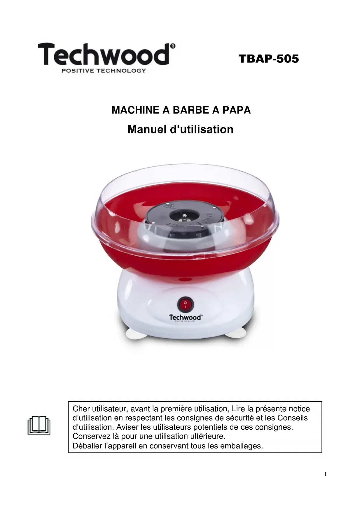 Utiliser uniquement des rallonges approuvées CE. La puissance admissible doit être au minimum de 16A, 250V, 3000W. Un Mauvais fonctionnement et l'utilisation incorrecte peuvent endommager l'appareil et causer des blessures à l'utilisateur. Cet appareil est conforme aux normes en vigueur, relatives à ce type de produit. L’appareil ne doit pas être utilisé, s’il est tombé ou, s’il présente des signes visibles de dommages ou s’il fuit. En ce qui concerne les instructions de nettoyage de l’appareil, se référer au paragraphe ci-après de la notice. Cet appareil est destiné exclusivement à un usage domestique. Quantité maximum de sucre : 10g Attendre 5 minutes de préchauffage avant utilisation. Temps d’utilisation maximal en continu 10-15 minutes. (soit, 5 Barbes à papa.) (*)Personne compétente qualifiée : technicien du service après- vente du constructeur ou de l'importateur ou toute personne qualifiée, habilitée et compétente pour effectuer ce type de réparation. INFORMATIONS GENERALES Le symbole «LIVRE OUVERT» signifie une recommandation de lire des choses importantes contenues dans la notice. Le symbole «POUBELLE» barrée, sigle DEEE (Déchet d’Equipement Electrique et Electronique) signifie, qu’en fin de vie, il ne doit pas être jeté aux déchets ménagers, mais déposé au centre de tri de la localité. La valorisation des déchets permet de contribuer à préserver notre environnement.6