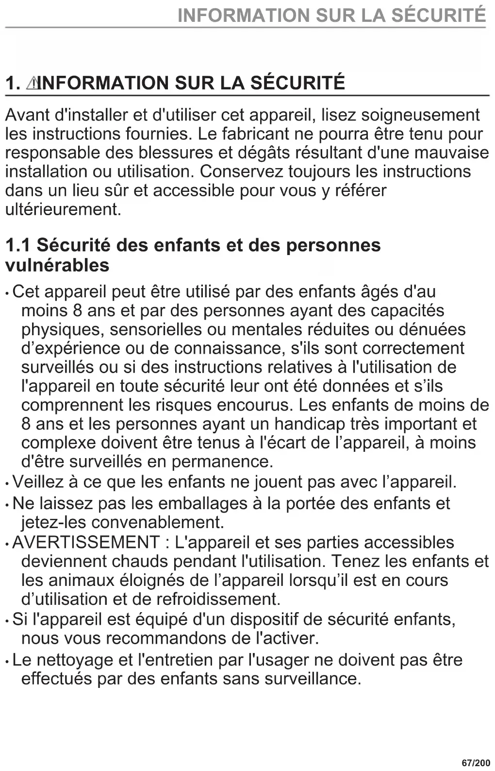 - Le nettoyage et l'entretien par l'usager ne doivent pas être effectués par des enfants sans surveillance. 67/200 INFORMATION SUR LA SÉCURITÉ1.2 Sécurité générale
