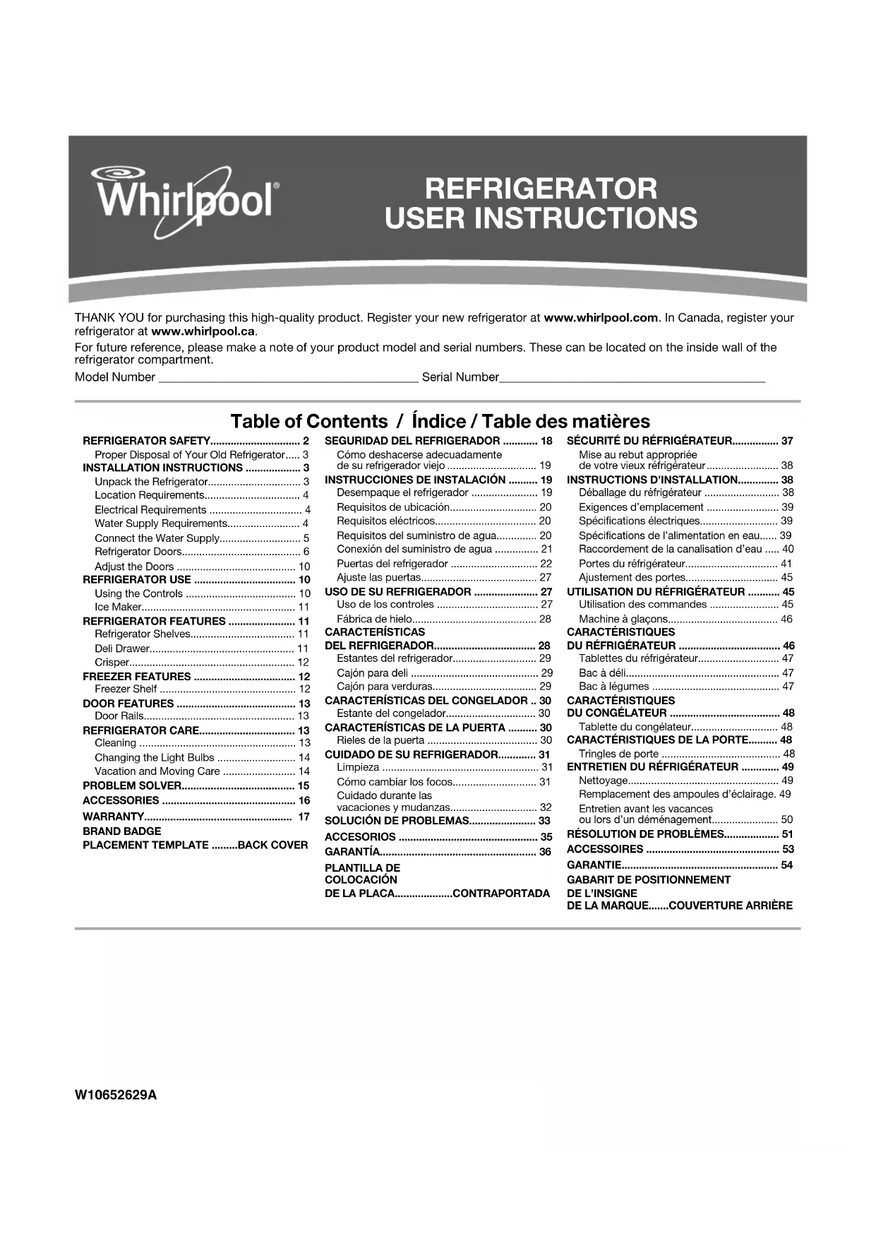 enlevés, modifiés ou ne peuvent pas être facilement identifiés. Le coût d’une réparation ou d’un remplacement dans le cadre de ces circonstances exclues est à la charge du client. CLAUSE D'EXONÉRATION DE RESPONSABILITÉ AU TITRE DES GARANTIES IMPLICITES LES GARANTIES IMPLICITES, Y COMPRIS LES GARANTIES APPLICABLES DE QUALITÉ MARCHANDE OU D'APTITUDE À UN USAGE PARTICULIER, SONT LIMITÉES À UN AN OU À LA PLUS COURTE PÉRIODE AUTORISÉE PAR LA LOI. Certains États et provinces ne permettent pas de limitation sur la durée des garanties implicites de qualité marchande ou d'aptitude à un usage particulier, de sorte que la limitation ci-dessus peut ne pas être applicable dans votre cas. Cette garantie vous confère des droits juridiques spécifiques et vous pouvez également jouir d’autres droits qui peuvent varier d’une juridiction à l'autre. EXONÉRATION DE RESPONSABILITÉ DANS LES DOMAINES NON COUVERTS PAR LA GARANTIE Whirlpool décline toute responsabilité au titre de la qualité, de la durabilité ou en cas de dépannage ou de réparation nécessaire sur ce gros appareil ménager autre que les responsabilités énoncées dans la présente garantie. Si vous souhaitez une garantie plus étendue ou plus complète que la garantie limitée fournie avec ce gros appareil ménager, adressez-vous à Whirlpool ou à votre détaillant pour obtenir les modalités d'achat d'une garantie étendue. LIMITATION DES RECOURS; EXCLUSION DES DOMMAGES FORTUITS OU INDIRECTS LE SEUL ET EXCLUSIF RECOURS DU CLIENT DANS LE CADRE DE LA PRÉSENTE GARANTIE LIMITÉE CONSISTE EN LA RÉPARATION PRÉVUE PAR LA PRÉSENTE. WHIRLPOOL N’ASSUME AUCUNE RESPONSABILITÉ POUR LES DOMMAGES FORTUITS OU INDIRECTS. Certains États et certaines provinces ne permettent pas l’exclusion ou la limitation des dommages fortuits ou indirects de sorte que ces limitations et exclusions peuvent ne pas être applicables dans votre cas. Cette garantie vous confère des droits juridiques spécifiques et vous pouvez également jouir d’autres droits qui peuvent varier d’une juridiction à l'autre.W10652629A EN/FR PN W10679185A