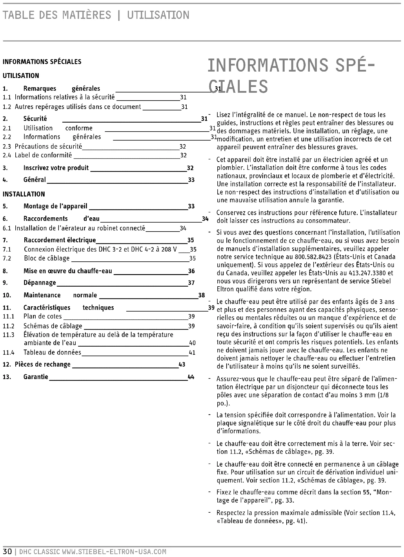 INFORMATIONS SPÉ- CIALES - Lisez l’intégralité de ce manuel. Le non-respect de tous les guides, instructions et règles peut entraîner des blessures ou des dommages matériels. Une installation, un réglage, une modification, un entretien et une utilisation incorrects de cet appareil peuvent entraîner des blessures graves. - Cet appareil doit être installé par un électricien agréé et un plombier. L’installation doit être conforme à tous les codes nationaux, provinciaux et locaux de plomberie et d’électricité. Une installation correcte est la responsabilité de l’installateur. Le non-respect des instructions d’installation et d’utilisation ou une mauvaise utilisation annule la garantie. - Conservez ces instructions pour référence future. L’installateur doit laisser ces instructions au consommateur. - Si vous avez des questions concernant l’installation, l’utilisation ou le fonctionnement de ce chauffe-eau, ou si vous avez besoin de manuels d’installation supplémentaires, veuillez appeler notre service technique au 800.582.8423 (États-Unis et Canada uniquement). Si vous appelez de l’extérieur des États-Unis ou du Canada, veuillez appeler les États-Unis au 413.247.3380 et nous vous dirigerons vers un représentant de service Stiebel Eltron qualifié dans votre région. - Le chauffe-eau peut être utilisé par des enfants âgés de 3 ans et plus et des personnes ayant des capacités physiques, senso- rielles ou mentales réduites ou un manque d’expérience et de savoir-faire, à condition qu’ils soient supervisés ou qu’ils aient reçu des instructions sur la façon d’utiliser le chauffe-eau en toute sécurité et ont compris les risques potentiels. Les enfants ne doivent jamais jouer avec le chauffe-eau. Les enfants ne doivent jamais nettoyer le chauffe-eau ou effectuer l’entretien de l’utilisateur à moins qu’ils ne soient surveillés. - Assurez-vous que le chauffe-eau peut être séparé de l’alimen- tation électrique par un disjoncteur qui déconnecte tous les pôles avec une séparation de contact d’au moins 3 mm (1/8 po.). - La tension spécifiée doit correspondre à l’alimentation. Voir la plaque signalétique sur le côté droit du chauffe-eau pour plus d’informations. - Le chauffe-eau doit être correctement mis à la terre. Voir sec- tion 11.2, «Schémas de câblage», pg. 39. - Le chauffe-eau doit être connecté en permanence à un câblage fixe. Pour utilisation sur un circuit de dérivation individuel uni- quement. Voir section 11.2, «Schémas de câblage», pg. 39. - Fixez le chauffe-eau comme décrit dans la section 55, “Mon- tage de l’appareil”, pg. 33. - Respectez la pression maximale admissible (Voir section 11.4, «Tableau de données», pg. 41).UTILISATION