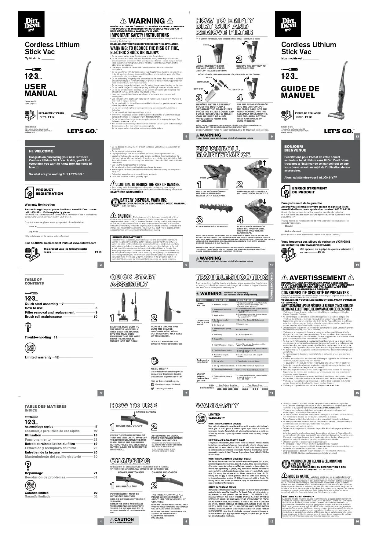 DES BATTERIES : RISQUE D’EXPLOSION OU D’EXPOSITION À DES MATIÈRES TOXIQUES.1-800-822-8837 BATTERIE AU LITHIUMIONLa batterie doit être recueillie, recyclée ou éliminée dans le respect de l’environnement Le sceau de recyclage des batteries au lithium-ion de la RBRC certifié par l’EPA indique que Techtronic Industries, société affiliée à Dirt Devil, participe volontairement à un programme de collecte et de recyclage des batteries usagées au Canada et aux États-Unis. Le programme de recyclage de la RBRC offre une solution de rechange pratique qui permet d’éviter que les batteries au lithium-ion soient jetées à la poubelle ou dans les ordures ménagères municipales, ce qui pourrait être illégal dans e plus amples sur les interdictions et les restrictions relatives à l’élimination de ces batteries dans votre région. La participation de Dirt Devil à ce programme témoigne de son engagement à protéger l’environnement et les ressources naturelles. nos ressources naturelles. Cordless Lithium Stick Vac My Model is: _________ Cordless Lithium Stick Vac PLUG IN & CHARGE UNIT UNTIL THE CHARGE INDICATOR LIGHT GOES OUT CHARGING MAY TAKE UP TO 6 HOURS.TIP: FOR BEST PERFORMANCE FULLY CHARGE THE PRODUCT BEFORE FIRST USE. POWER BUTTON