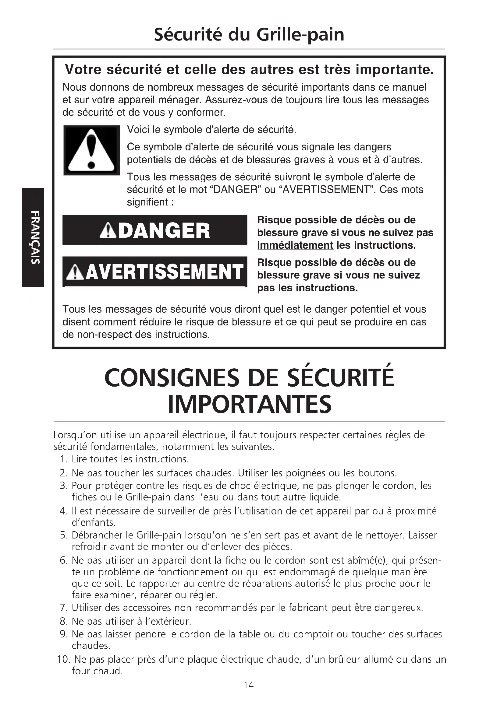 - Comment commander des accessoires et des pièces de rechange 4885_KMTT_UCG_F_1.indd 134885_KMTT_UCG_F_1.indd 13 12/6/05 3:11:10 PM12/6/05 3:11:10 PM14 FRANÇAIS Sécurité du Grille-pain Votre sécurité et celle des autres est très importante. Nous donnons de nombreux messages de sécurité importants dans ce manuel et sur votre appareil ménager. Assurez-vous de toujours lire tous les messages de sécurité et de vous y conformer.Voici le symbole d’alerte de sécurité.Ce symbole d’alerte de sécurité vous signale les dangers potentiels de décès et de blessures graves à vous et à d’autres.Tous les messages de sécurité suivront le symbole d’alerte de sécurité et le mot “DANGER” ou “AVERTISSEMENT”. Ces mots signifient :Risque possible de décès ou de blessure grave si vous ne suivez pas immédiatement les instructions.Risque possible de décès ou de blessure grave si vous ne suivez pas les instructions.Tous les messages de sécurité vous diront quel est le danger potentiel et vous disent comment réduire le risque de blessure et ce qui peut se produire en cas de non-respect des instructions. AVERTISSEMENT DANGER p. 24