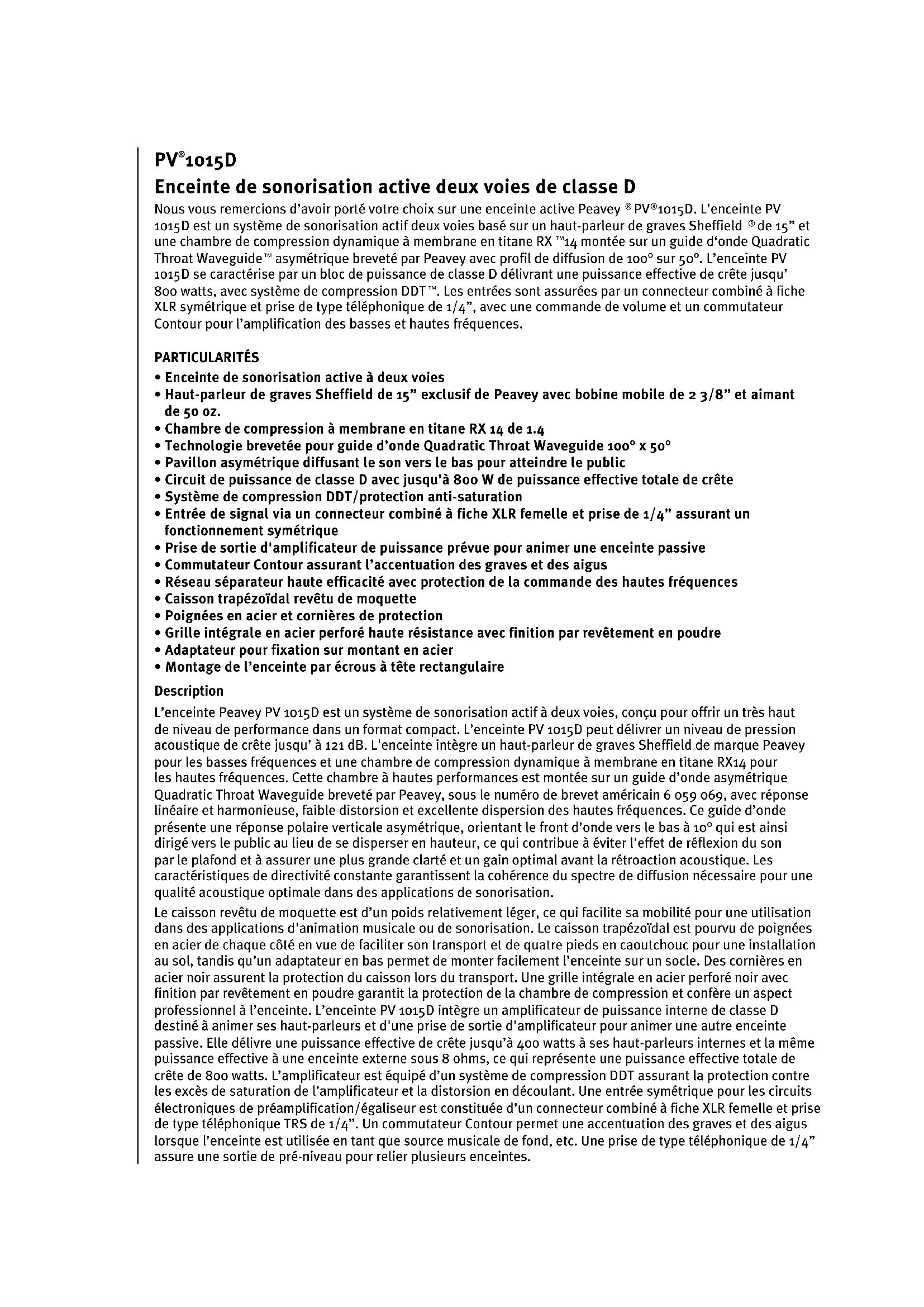 - Montage de l’enceinte par écrous à tête rectangulaire Description L’enceinte Peavey PV 1015D est un système de sonorisation actif à deux voies, conçu pour offrir un très haut de niveau de performance dans un format compact. L’enceinte PV 1015D peut délivrer un niveau de pression acoustique de crête jusqu’ à 121 dB. L'enceinte intègre un haut-parleur de graves Sheffield de marque Peavey pour les basses fréquences et une chambre de compression dynamique à membrane en titane RX14 pour les hautes fréquences. Cette chambre à hautes performances est montée sur un guide d’onde asymétrique Quadratic Throat Waveguide breveté par Peavey, sous le numéro de brevet américain 6 059 069, avec réponse linéaire et harmonieuse, faible distorsion et excellente dispersion des hautes fréquences. Ce guide d’onde présente une réponse polaire verticale asymétrique, orientant le front d’onde vers le bas à 10° qui est ainsi dirigé vers le public au lieu de se disperser en hauteur, ce qui contribue à éviter l'effet de réflexion du son par le plafond et à assurer une plus grande clarté et un gain optimal avant la rétroaction acoustique. Les caractéristiques de directivité constante garantissent la cohérence du spectre de diffusion nécessaire pour une qualité acoustique optimale dans des applications de sonorisation. Le caisson revêtu de moquette est d’un poids relativement léger, ce qui facilite sa mobilité pour une utilisation dans des applications d'animation musicale ou de sonorisation. Le caisson trapézoïdal est pourvu de poignées en acier de chaque côté en vue de faciliter son transport et de quatre pieds en caoutchouc pour une installation au sol, tandis qu’un adaptateur en bas permet de monter facilement l’enceinte sur un socle. Des cornières en acier noir assurent la protection du caisson lors du transport. Une grille intégrale en acier perforé noir avec finition par revêtement en poudre garantit la protection de la chambre de compression et confère un aspect professionnel à l’enceinte. L’enceinte PV 1015D intègre un amplificateur de puissance interne de classe D destiné à animer ses haut-parleurs et d'une prise de sortie d'amplificateur pour animer une autre enceinte passive. Elle délivre une puissance effective de crête jusqu’à 400 watts à ses haut-parleurs internes et la même puissance effective à une enceinte externe sous 8 ohms, ce qui représente une puissance effective totale de crête de 800 watts. L’amplificateur est équipé d’un système de compression DDT assurant la protection contre les excès de saturation de l’amplificateur et la distorsion en découlant. Une entrée symétrique pour les circuits électroniques de préamplification/égaliseur est constituée d’un connecteur combiné à fiche XLR femelle et prise de type téléphonique TRS de 1/4”. Un commutateur Contour permet une accentuation des graves et des aigus lorsque l’enceinte est utilisée en tant que source musicale de fond, etc. Une prise de type téléphonique de 1/4” assure une sortie de pré-niveau pour relier plusieurs enceintes.3