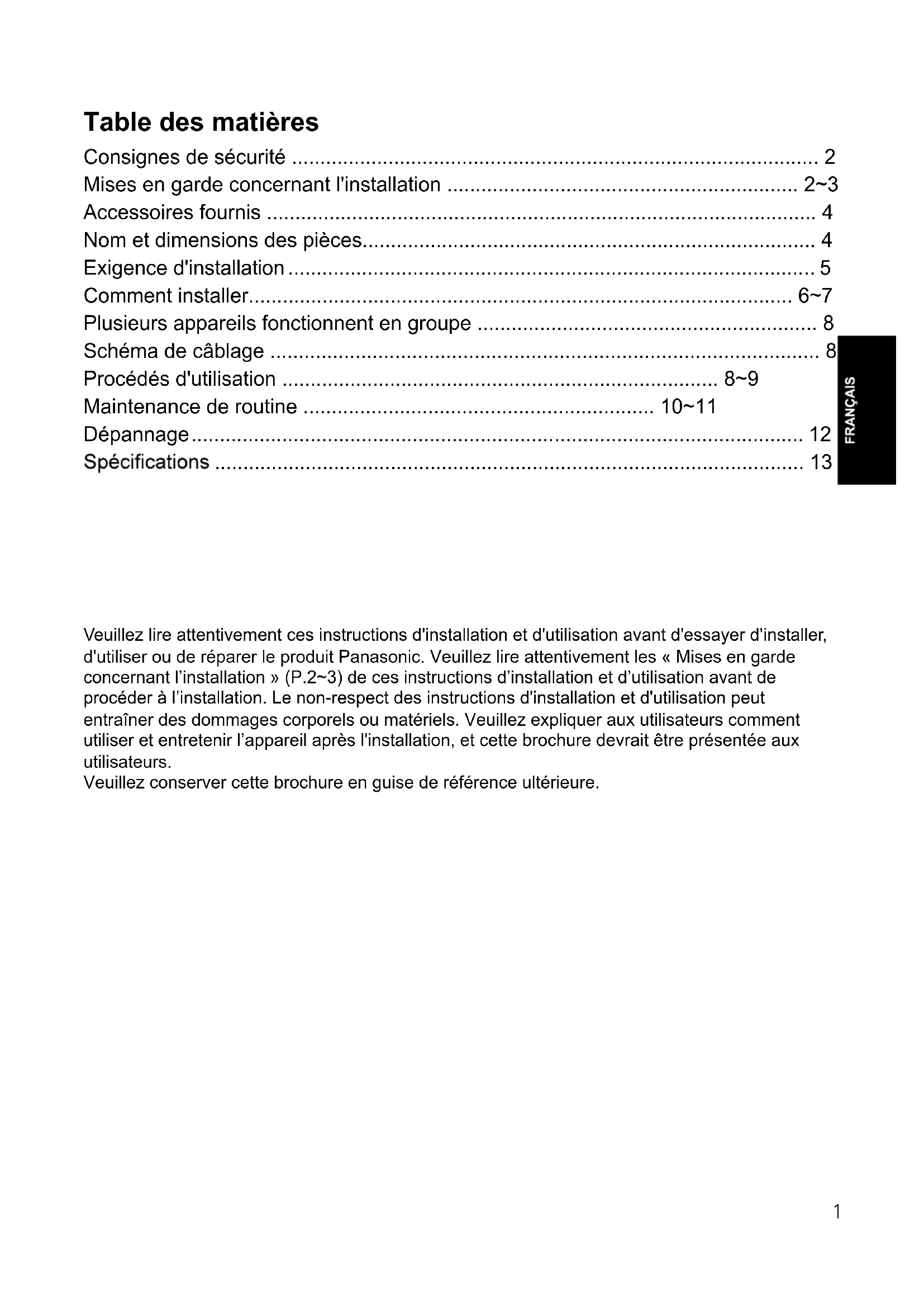 Veuillez lire attentivement ces instructions d'installation et d'utilisation avant d'essayer d'installer, d'utiliser ou de réparer le produit Panasonic. Veuillez lire attentivement les « Mises en garde concernant l’installation » (P.2~3) de ces instructions d’installation et d’utilisation avant de procéder à l’installation. Le non-respect des instructions d'installation et d'utilisation peut entraîner des dommages corporels ou matériels. Veuillez expliquer aux utilisateurs comment utiliser et entretenir l’appareil après l'installation, et cette brochure devrait être présentée aux utilisateurs. Veuillez conserver cette brochure en guise de référence ultérieure. 1Les ex utilisateurs ou à d'autres personnes et d’éviter les dégâts matériels. question est mal utilisé. AVERTISSEMENT avec rigueur le fait que cela pourrait entraîner la mort ou des blessures graves. ATTENTION avec rigueur le fait que cela pourrait entraîner des blessures graves ou des dégâts matériels. Ce symbole indique l'élément « OBLIGATOIRE » qui doit être suivi sans défaillance. Ce symbole indique l'élément « INTERDIT » de suivre. Si le cordon d'alimentation est endommagé, il doit être remplacé par le fabricant, éviter tout danger. Cet appareil peut être utilisé par des enfants âgés de 8 ans et plus et des personnes ayant des capacités physiques, sensorielles ou mentales réduites ou un ou reçu des instructions concernant l'utilisation de l'appareil de manière sécuritaire et qui comprennent les dangers impliqués. Les enfants ne doivent pas jouer avec l'appareil. Le nettoyage et l’entretien de l'utilisateur ne doivent pas être faits par des enfants sans surveillance. Assurez-vous de débrancher l'alimentation avant de nettoyer l’appareil. Consignes de sécurité Veuillez respecter strictement Mises en garde concernant l'installation Veuillez installer un interrupteur multipolaire dont la séparation de contact est supérieure à 3 mm (Interrupteur bipolaire). Autrement dit, il peut provoquer un court-circuit, entraînant ainsi un incendie. N’utilisez pas l’appareil sous une tension autre que la tension nominale. Autrement dit, cela pourrait endommager l’appareil ou provoquer un incendie. L’appareil doit être mis en terre. Autrement dit, il peut provoquer un choc électrique en cas de problème ou de fuite électrique. Le câblage doit être bien branché sans aucun relâchement. Autrement dit, il peut provoquer un court-circuit, entraînant ainsi un incendie. L'installation doit être effectuée par une personne autorisée. L’appareil doit être installé solidement. Autrement dit, l’appareil peut tomber et causer éventuellement des blessures. Ne pas reconstruire cet appareil. Autrement dit, cela pourrait endommager l’appareil ou causer des blessures. AVERTISSEMENT 2Mises en garde concernant l'installation L’appareil doit être installé par 2 personnes. Autrement dit, l’appareil peut tomber et causer éventuellement des blessures. Les pièces à usage spécial ou dédiés, telles que les accessoires de montage, doivent être utilisées si de telles pièces sont fournies. Autrement dit, l’appareil peut tomber et causer éventuellement des blessures. L’appareil doit être monté sur un bâtiment peut supporter plus de 5 fois le poids de l’appareil. Le bâtiment doit être renforcé si sa solidité ne peut être assurée. Autrement dit, l’appareil peut tomber et causer éventuellement des blessures. Veuillez porter des gants lors de l'installation de l’appareil. Autrement dit, cela peut causer des dégâts. ATTENTION L’appareil doit être bien installé. Les composants doivent être bien installés. Autrement dit, l’appareil peut causer des blessures en cas de chute. N'installez pas l’appareil en utilisant une méthode qui n'est pas approuvée dans les instructions d'installation et d'utilisation. Autrement dit, l’appareil peut tomber et causer éventuellement des blessures. Il est interdit d'installer le produit dans des endroits tels que des machines, des installations chimiques ou des installations de recherche où il sera exposé à des gaz nocifs contenant des acides, des solvants alcalins, organiques, des fumées de peinture, etc., à des gaz contenant des ingrédients corrosifs. Cela pourrait provoquer une intoxication au gaz, la corrosion et la dégradation de l’appareil qui se traduit par un incendie. AVERTISSEMENT Il est interdit de l'installer dans les endroits suivants. Ne pas installer l’appareil dans un endroit où il y a de la vapeur. Emplacement contenant du gaz combustible ou des émissions de gaz d'échappement. N'installez pas l’appareil loin de la fenêtre et du mur. A l’Intérieur A l’extérieur Autrement dit, il peut provoquer un court-circuit, entraînant ainsi un incendie. Autrement dit, il peut provoquer un court-circuit, entraînant ainsi un incendie. Autrement dit, l’appareil peut se mouiller sous la pluie et provoquer un court-circuit. 3Les pièces jointes suivantes se trouvent dans la boîte d'emballage de l’appareil. Prenez soin veuillez contacter notre Centre de Service Après-Vente ou le revendeur. Numéro Dessin Nom Quantité Numéro Dessin Nom Quantité RONDELLE 6 Boulon M8 × 60L 6 Rondelle élastique