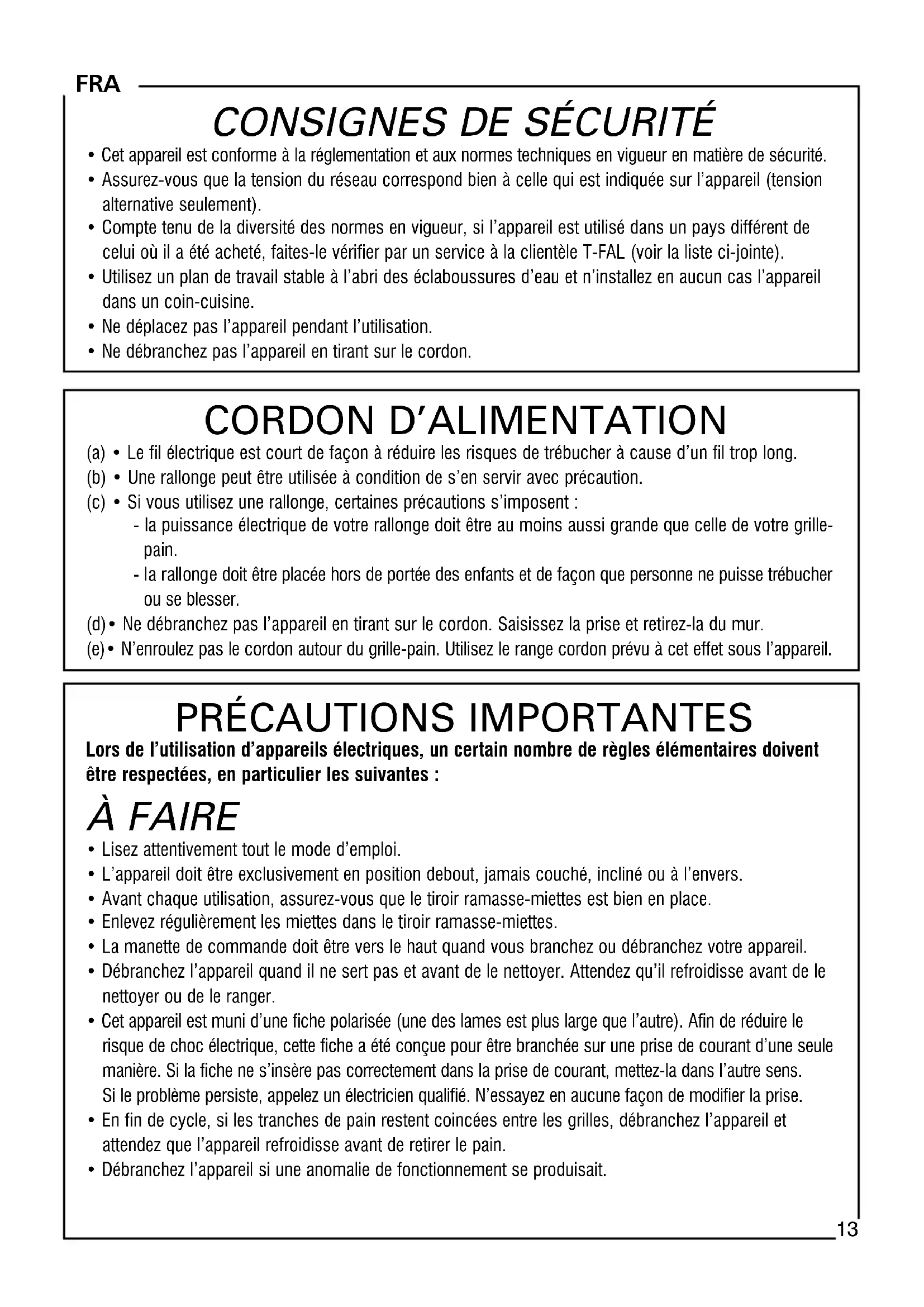 - Lisez attentivement tout le mode d’emploi.• L’appareil doit être exclusivement en position debout, jamais couché, incliné ou à l’envers.• Avant chaque utilisation, assurez-vous que le tiroir ramasse-miettes est bien en place.• Enlevez régulièrement les miettes dans le tiroir ramasse-miettes.• La manette de commande doit être vers le haut quand vous branchez ou débranchez votre appareil.• Débranchez l’appareil quand il ne sert pas et avant de le nettoyer. Attendez qu’il refroidisse avant de lenettoyer ou de le ranger.• Cet appareil est muni d’une fiche polarisée (une des lames est plus large que l’autre). Afin de réduire lerisque de choc électrique, cette fiche a été conçue pour être branchée sur une prise de courant d’une seulemanière. Si la fiche ne s’insère pas correctement dans la prise de courant, mettez-la dans l’autre sens. Si le problème persiste, appelez un électricien qualifié. N’essayez en aucune façon de modifier la prise.• En fin de cycle, si les tranches de pain restent coincées entre les grilles, débranchez l’appareil et attendez que l’appareil refroidisse avant de retirer le pain.• Débranchez l’appareil si une anomalie de fonctionnement se produisait. FRA