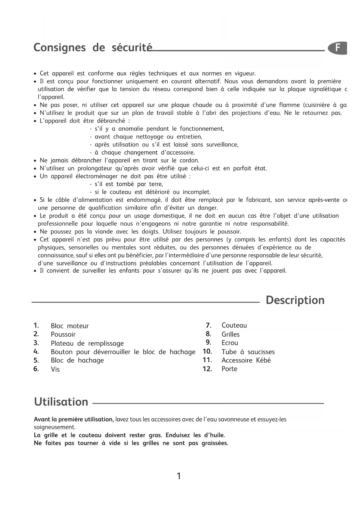couv_3_volets:Mise en page 1 10/12/09 8:16 Page 41 Utilisation Avant la première utilisation, lavez tous les accessoires avec de l’eau savonneuse et essuyez-les soigneusement. La grille et le couteau doivent rester gras. Enduisez les d’huile. Ne faites pas tourner à vide si les grilles ne sont pas graissées.