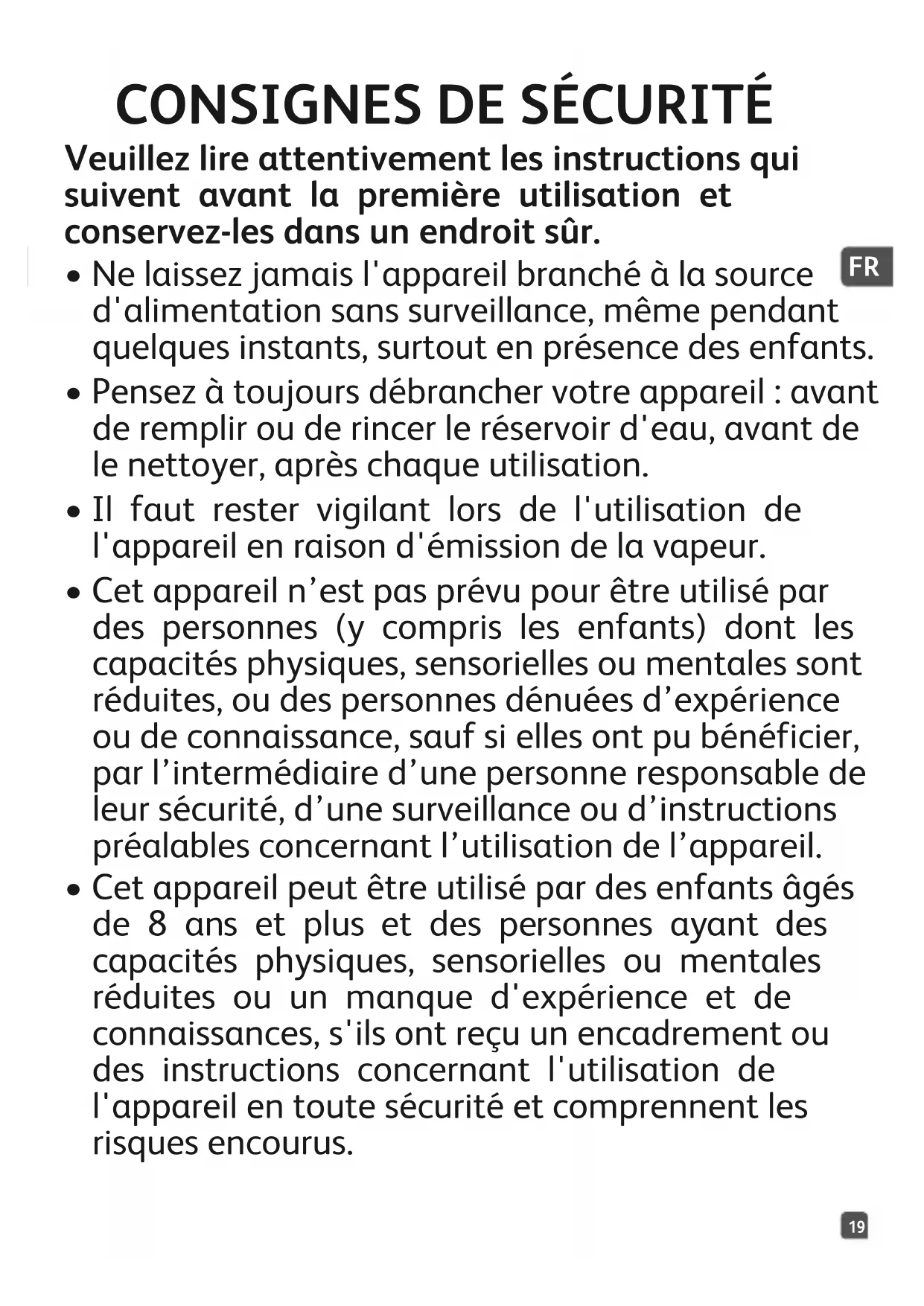 - Cet appareil n’est pas prévu pour être utilisé par des personnes (y compris les enfants) dont les capacités physiques, sensorielles ou mentales sont réduites, ou des personnes dénuées d’expérience ou de connaissance, sauf si elles ont pu bénéficier, par l’intermédiaire d’une personne responsable de leur sécurité, d’une surveillance ou d’instructions préalables concernant l’utilisation de l’appareil.