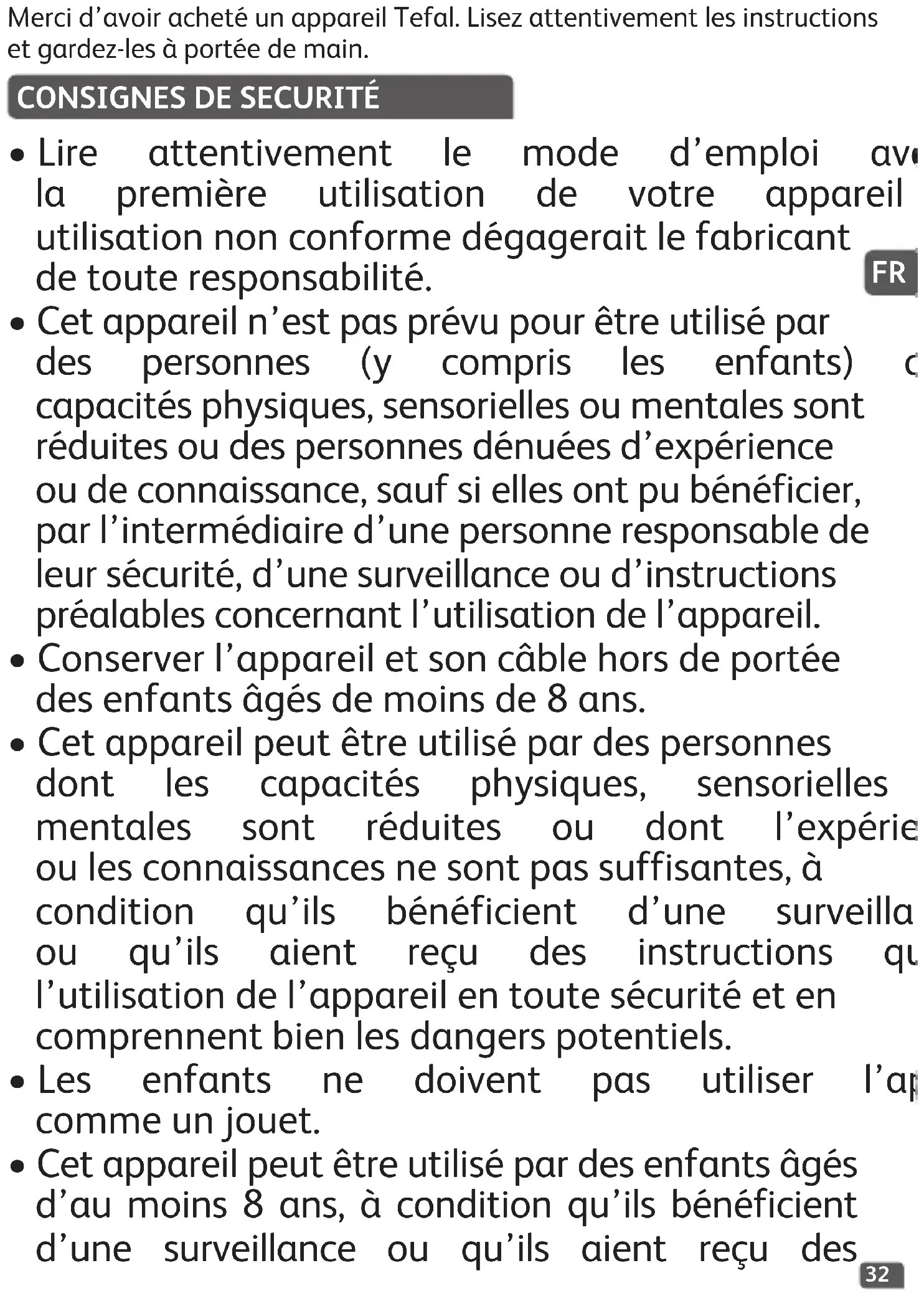- Cetappareilpeutêtreutilisépardesenfantsâgés d’au moins 8 ans, à condition qu’ils bénéficient d’une surveillance ou qu’ils aient reçu des Mercid’avoirachetéunappareilTefal.Lisezattentivementlesinstructions etgardez-lesàportéedemain.33 instructions quant à l’utilisation de l’appareil entoutesécuritéetqu’ilscomprennentbienles dangersencourus.Lenettoyageetl’entretienpar l’utilisateurnedoiventpasêtreeffectuéspardes enfants,àmoinsqu’ilsnesoientâgésdeplusde8 ansetqu’ilssoientsouslasurveillanced’unadulte.