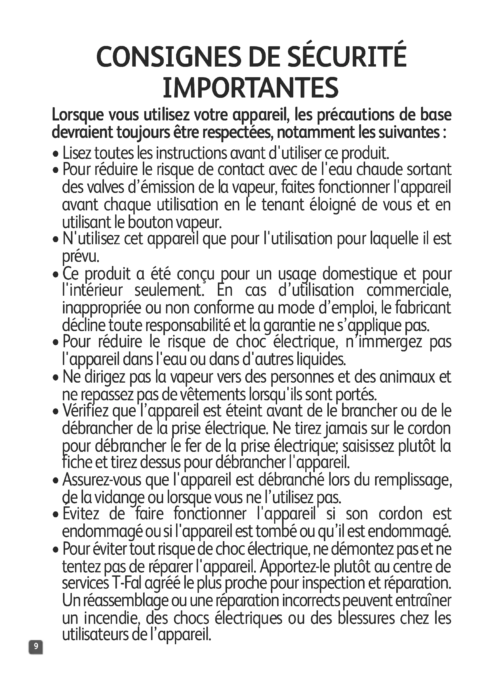 - Pour éviter tout risque de choc électrique, ne démontez pas et ne tentez pas de réparer l'appareil. Apportez-le plutôt au centre de services T-Fal agréé le plus proche pour inspection et réparation. Un réassemblage ou une réparation incorrects peuvent entraîner un incendie, des chocs électriques ou des blessures chez les utilisateurs de l’appareil. 9100017919-01 DV86XX U1.qxp_110x154-9100017919 30/03/15 14:12 Page910
