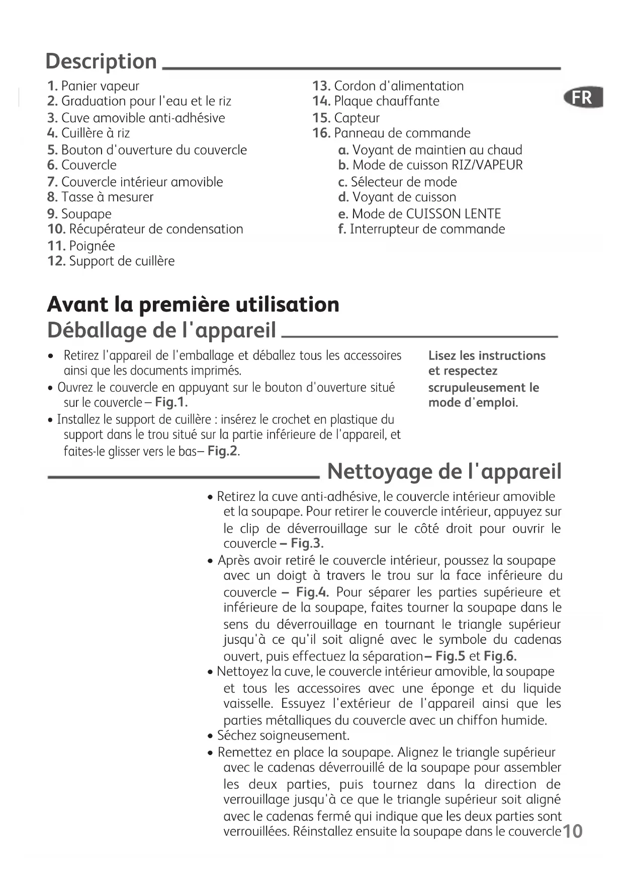 a. Voyant de maintien au chaud b. Mode de cuisson RIZ/VAPEUR c. Sélecteur de mode d. Voyant de cuisson e. Mode de CUISSON LENTE f. Interrupteur de commande TEFAL781-3in1_NC00111822_Mise en page 1 26/04/12 18:28 Page1011 – Fig.7. Assurez-vous que le triangle de la soupape est bien aligné avec le triangle sur le couvercle et poussez fermement jusqu'à ce qu'elle soit correctement installée.