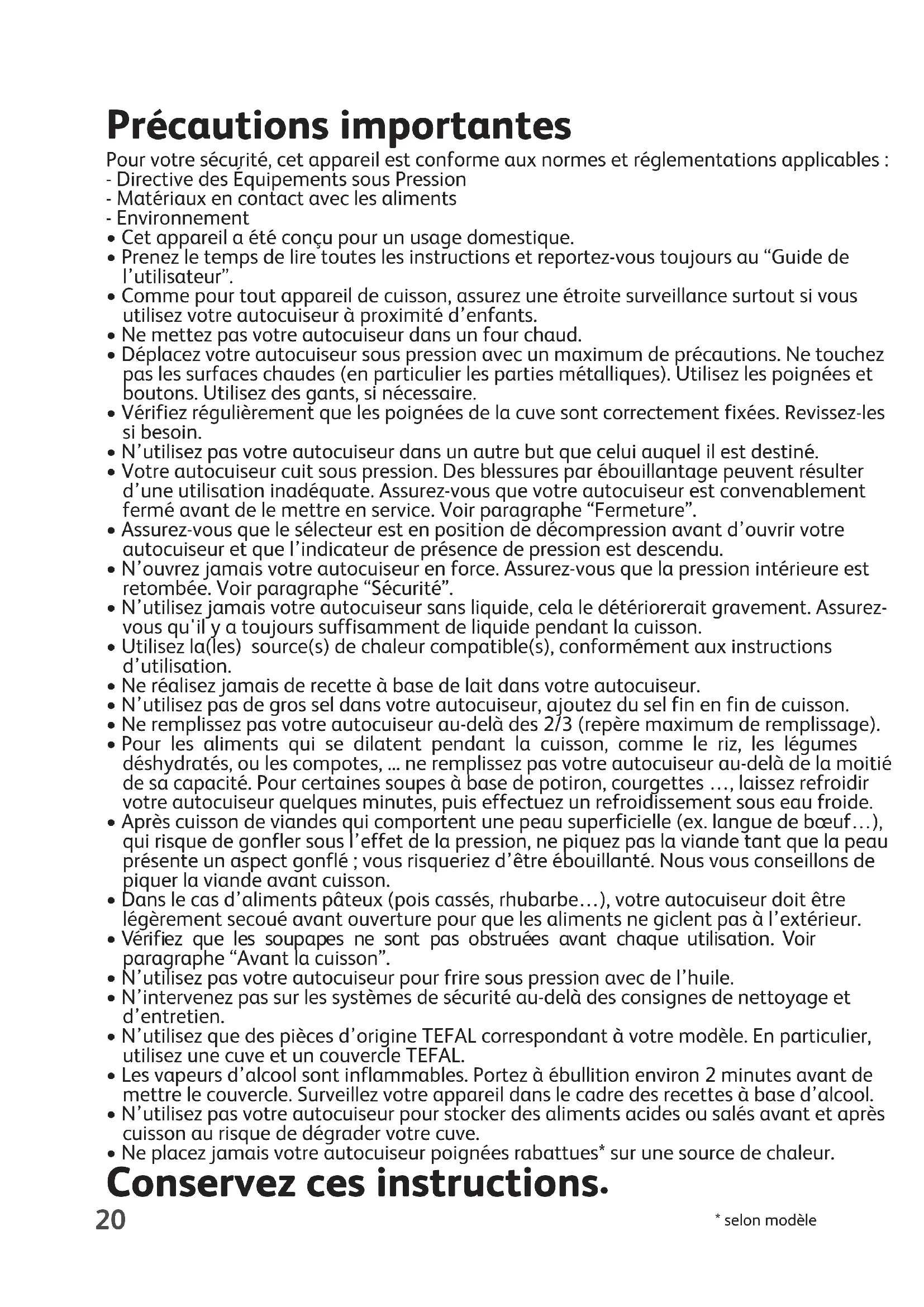 - selon modèle Précautions importantes Pour votre sécurité, cet appareil est conforme aux normes et réglementations applicables : - Directive des Équipements sous Pression - Matériaux en contact avec les aliments - Environnement