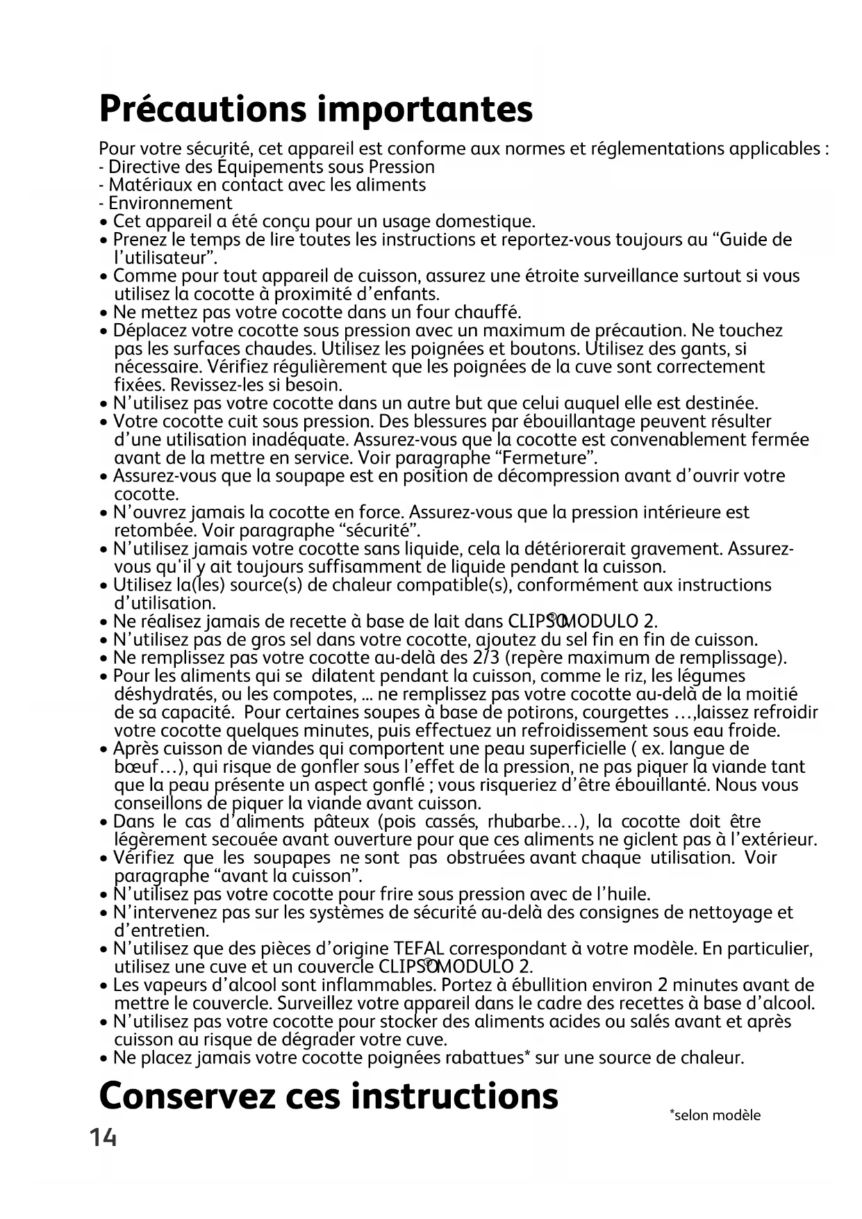 - depending on model14 Précautions importantes Pour votre sécurité, cet appareil est conforme aux normes et réglementations applicables : - Directive des Équipements sous Pression - Matériaux en contact avec les aliments - Environnement