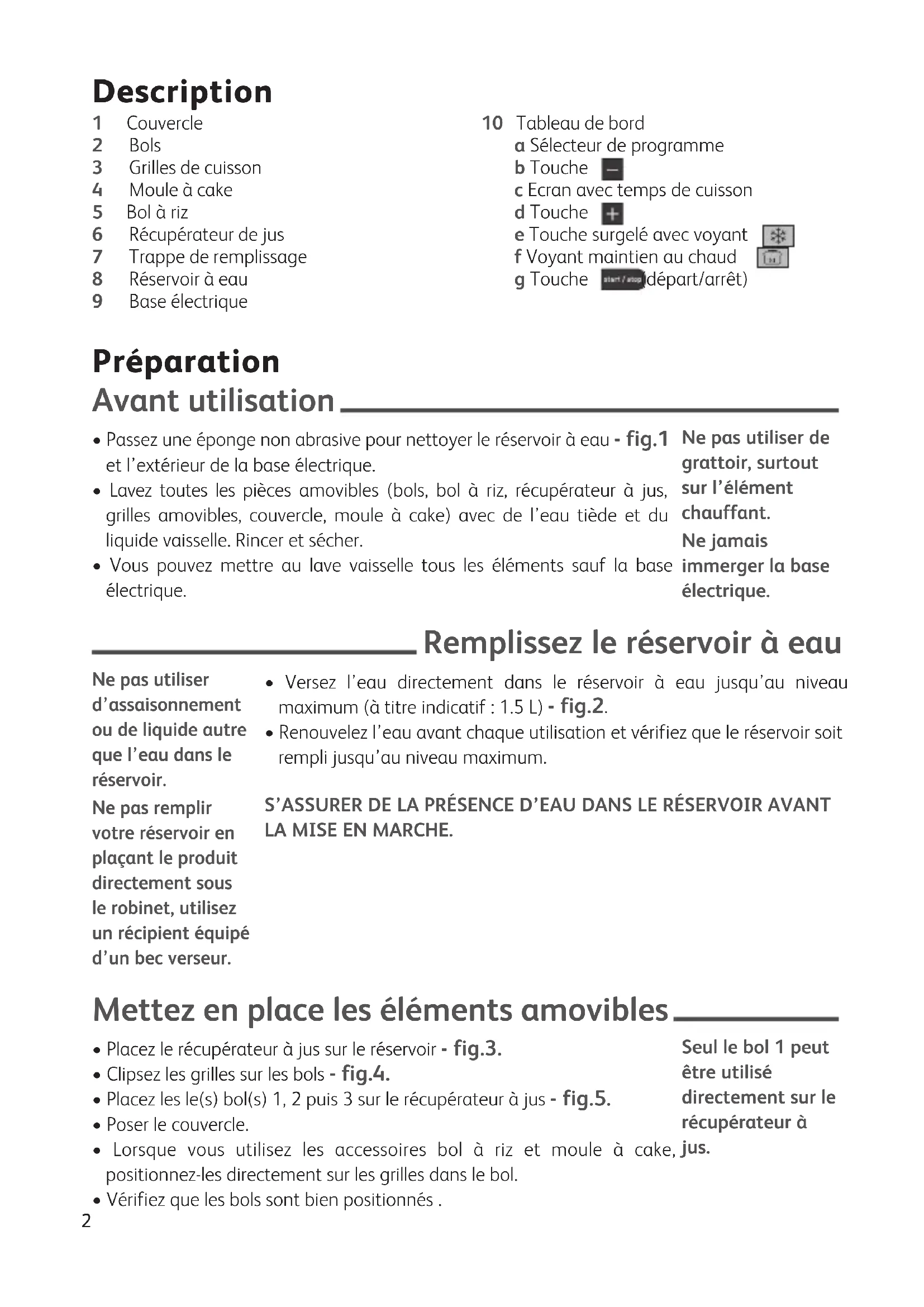 TEFAL695-SteamerSteamN'Light_NC00027908_STEAMN-LIGHT 13/01/12 11:36 PageCTEFAL695-SteamerSteamN'Light_NC00027908_STEAMN-LIGHT 13/01/12 11:36 PageD1 Couvercle 2 Bols 3 Grilles de cuisson 4 Moule à cake 5 Bol à riz 6 Récupérateur de jus 7 Trappe de remplissage 8 Réservoir à eau 9 Base électrique 10 Tableau de bord a Sélecteur de programme b Touche c Ecran avec temps de cuisson d Touche e Touche surgelé avec voyant f Voyant maintien au chaud g Touche (départ/arrêt) Description Préparation Avant utilisation