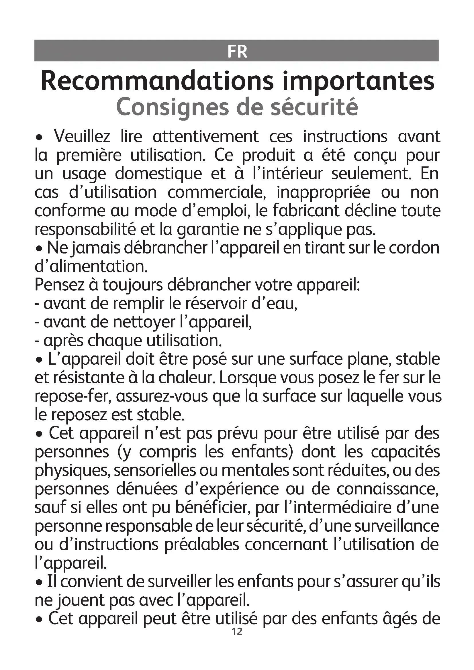 - Cet appareil peut être utilisé par des enfants âgés de13 8 ans et plus et des personnes ayant des capacités physiques, sensorielles ou mentales réduites ou un manque d’expérience et de connaissances, s’ils ont reçu un encadrement ou des instructions concernant l’utilisation de l’appareil en toute sécurité et comprennent les risques encourus. Les enfants ne doivent pas jouer avec l’appareil. Les enfants ne doivent ni nettoyer l’appareil ni s’occuper de son entretien sans surveillance. Gardez le fer et le cordon hors de la portée des enfants de moins de 8 ans lorsque le fer est sous tension ou en cours de refroidissement.