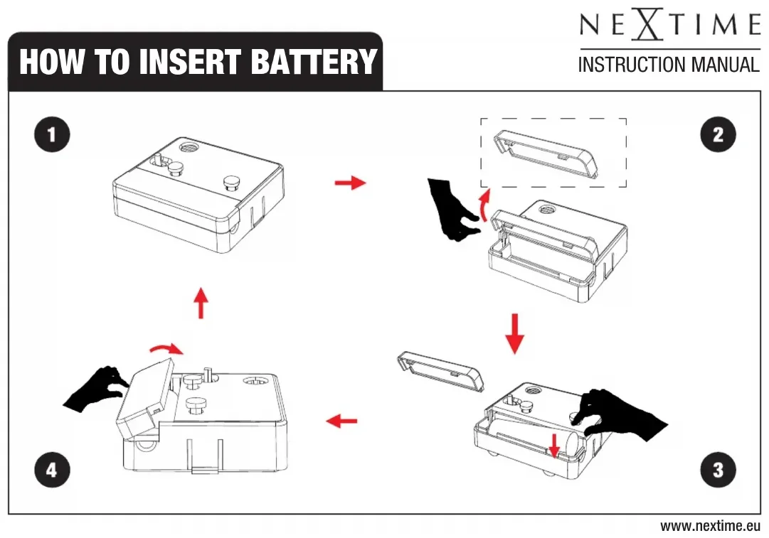 - Ouvrez le couvercle du compartiment des piles situé à l’arrière de l’horloge et insérez la pile (non incluse). Il est recommandé d’utiliser des piles alcalines. Refermez le couvercle du compartiment des piles