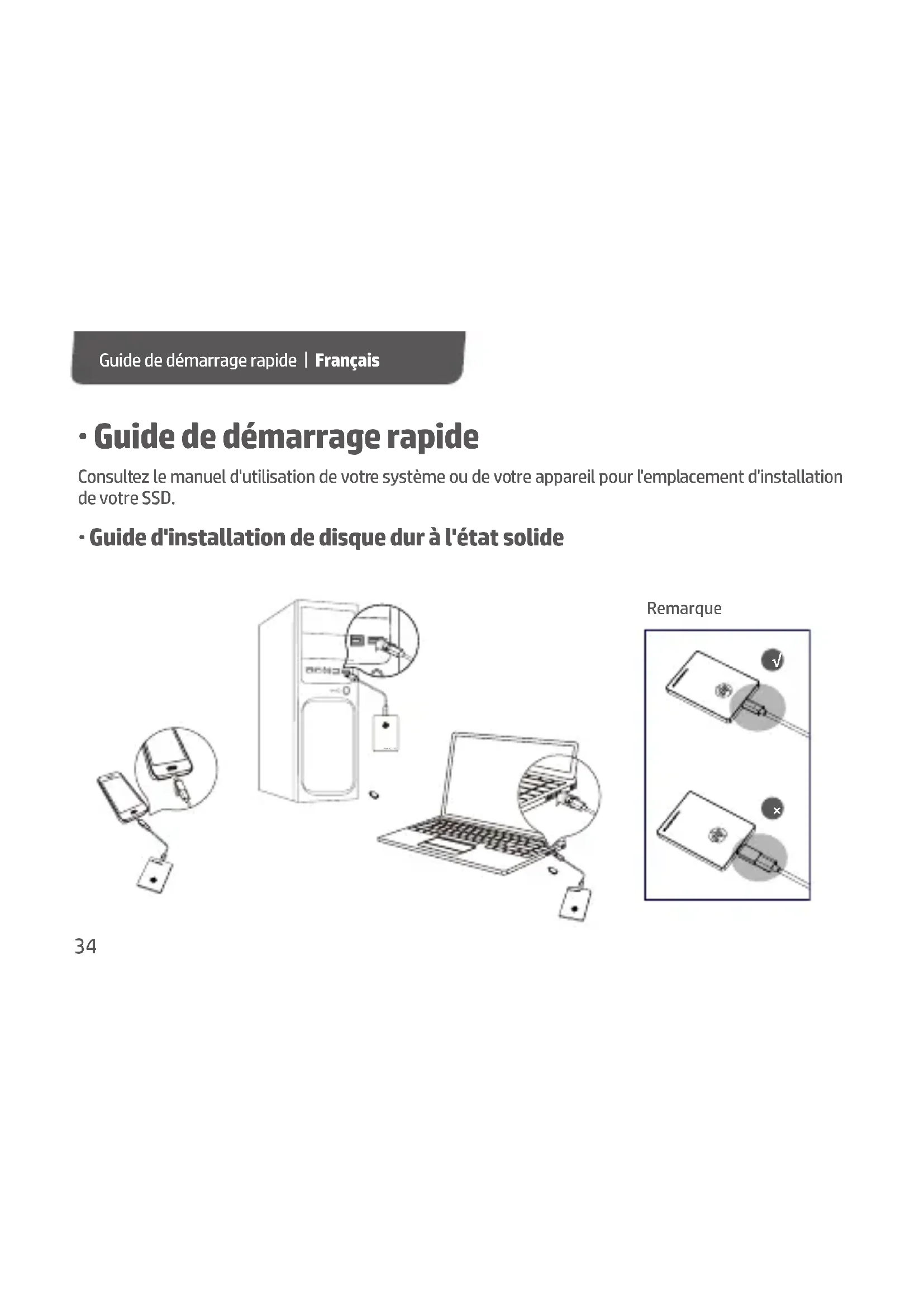 - Guide d'installation de disque dur à l'état solide Consultez le manuel d'utilisation de votre système ou de votre appareil pour l'emplacement d'installation de votre SSD. Guide de démarrage rapide | Français Portable SSD P700