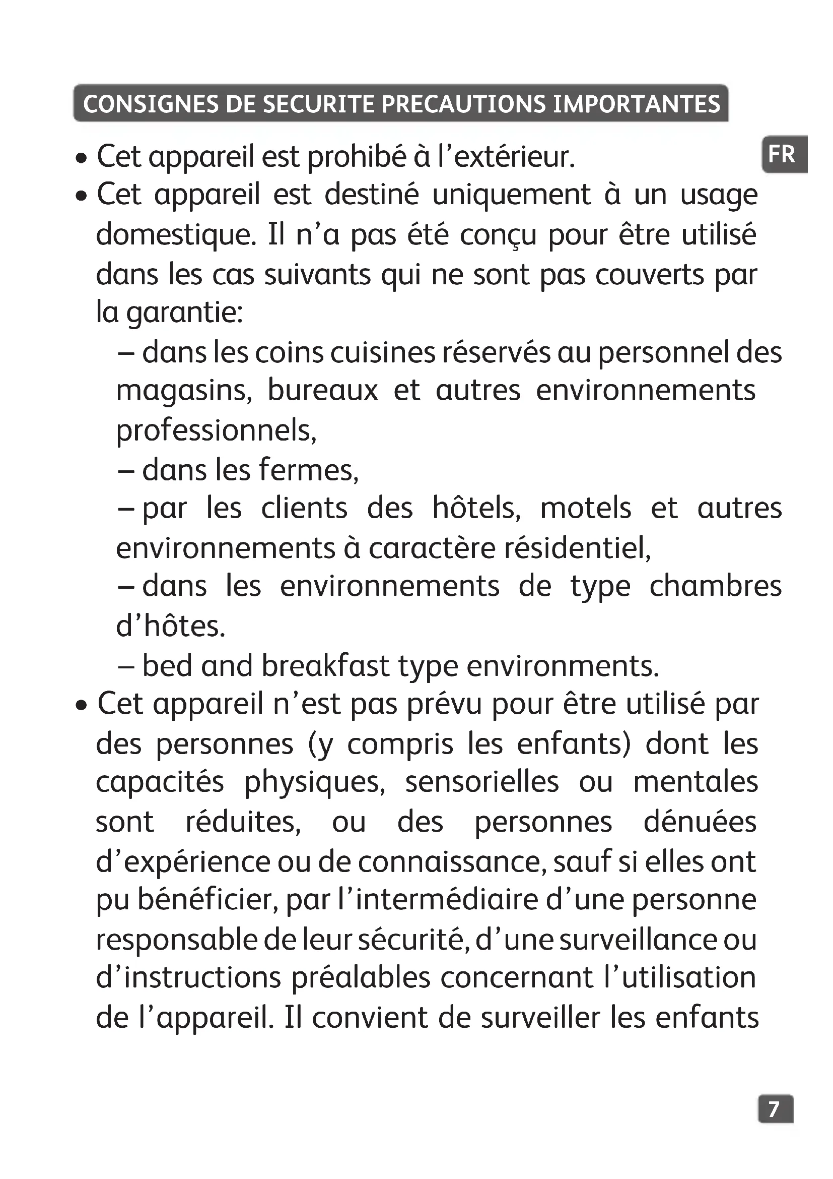 - Cet appareil est destiné uniquement à un usage domestique. Il n’a pas été conçu pour être utilisé dans les cas suivants qui ne sont pas couverts par la garantie: – dans les coins cuisines réservés au personnel des magasins, bureaux et autres environnements professionnels, – dans les fermes, – par les clients des hôtels, motels et autres environnements à caractère résidentiel, – dans les environnements de type chambres d’hôtes. – bed and breakfast type environments.