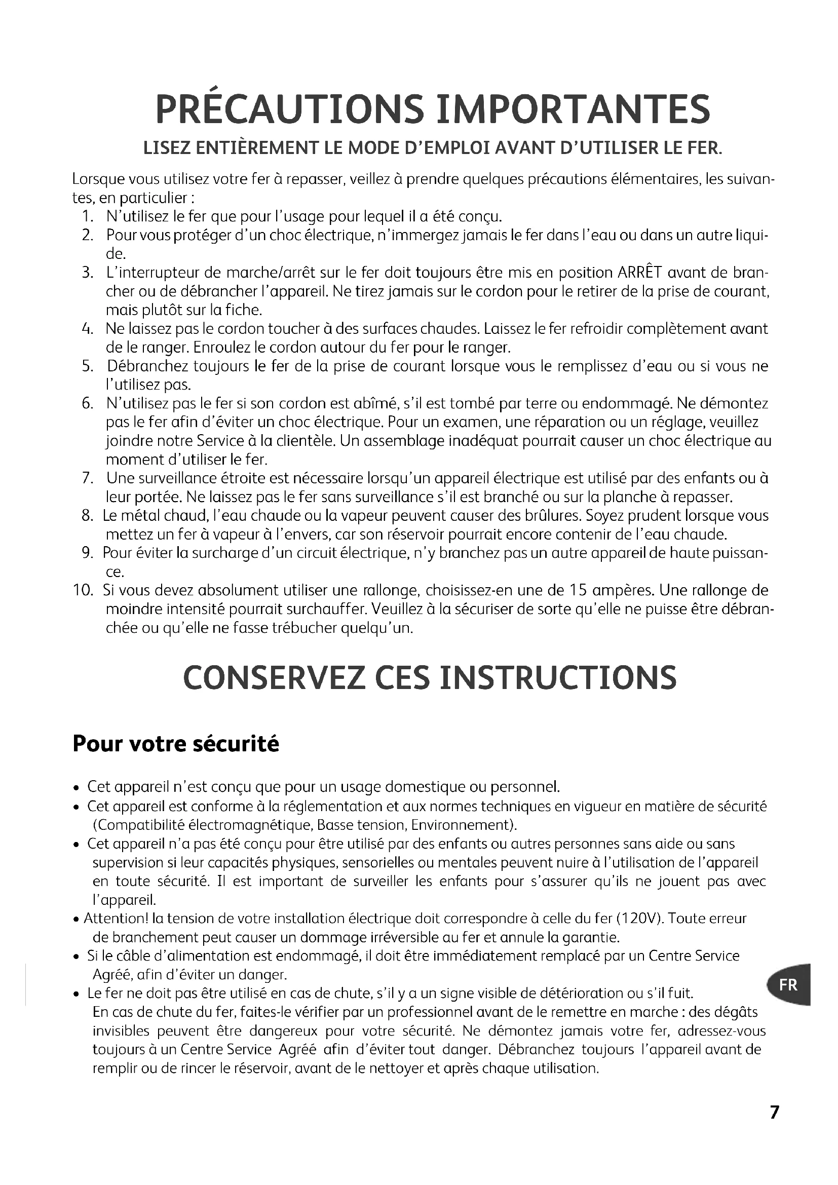 - Cet appareil n’est conçu que pour un usage domestique ou personnel.• Cet appareil est conforme à la réglementation et aux normes techniques en vigueur en matière de sécurité(Compatibilité électromagnétique, Basse tension, Environnement).• Cet appareil n’a pas été conçu pour être utilisé par des enfants ou autres personnes sans aide ou sanssupervision si leur capacités physiques, sensorielles ou mentales peuvent nuire à l’utilisation de l’appareil en toute sécurité. Il est important de surveiller les enfants pour s’assurer qu’ils ne jouent pas avec l’appareil.• Attention! la tension de votre installation électrique doit correspondre à celle du fer (120V). Toute erreurde branchement peut causer un dommage irréversible au fer et annule la garantie.• Si le câble d’alimentation est endommagé, il doit être immédiatement remplacé par un Centre ServiceAgréé, afin d’éviter un danger.• Le fer ne doit pas être utilisé en cas de chute, s’il y a un signe visible de détérioration ou s’il fuit.En cas de chute du fer, faites-le vérifier par un professionnel avant de le remettre en marche : des dégâts invisibles peuvent être dangereux pour votre sécurité. Ne démontez jamais votre fer, adressez-vous toujours à un Centre Service Agréé afin d’éviter tout danger. Débranchez toujours l’appareil avant deremplir ou de rincer le réservoir, avant de le nettoyer et après chaque utilisation.