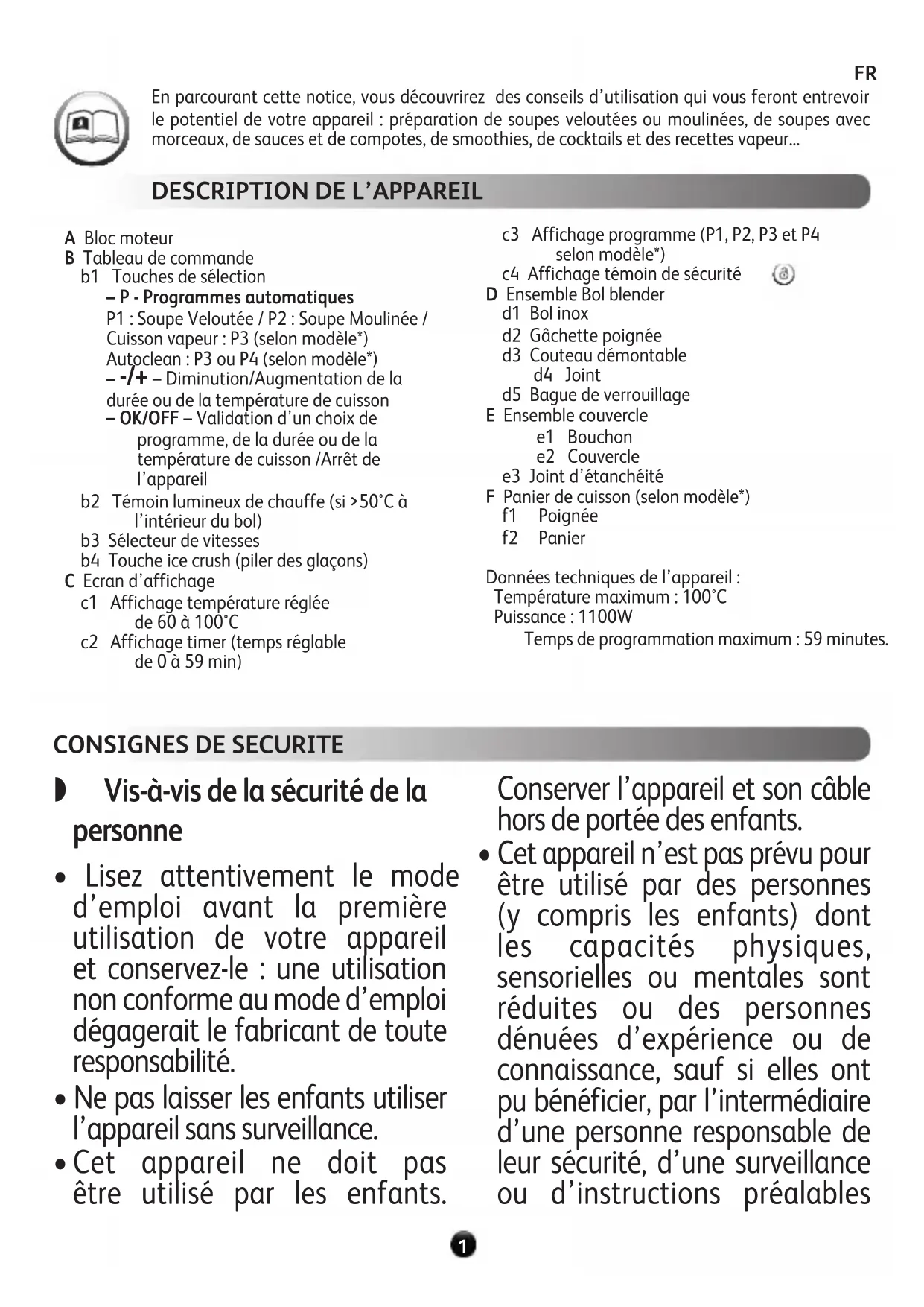 START START1 A Bloc moteur B Tableau de commande b1 Touches de sélection – P - Programmes automatiques P1 : Soupe Veloutée / P2 : Soupe Moulinée / Cuisson vapeur: P3 (selon modèle*) Autoclean: P3 ou P4 (selon modèle*) – -/+ – Diminution/Augmentation de la durée ou de la température de cuisson – OK/OFF – Validation d’un choix de programme, de la durée ou de la température de cuisson /Arrêt de l’appareil b2 Témoin lumineux de chauffe (si >50°C à l’intérieur du bol) b3 Sélecteur de vitesses b4 Touche ice crush (piler des glaçons) C Ecran d’affichage c1 Affichage température réglée de 60 à 100°C c2 Affichage timer (temps réglable de 0 à 59 min) c3 Affichage programme (P1, P2, P3 et P4 selon modèle*) c4 Affichage témoin de sécurité STARTSTART D Ensemble Bol blender d1 Bol inox d2 Gâchette poignée d3 Couteau démontable d4 Joint d5 Bague de verrouillage E Ensemble couvercle e1 Bouchon e2 Couvercle e3 Joint d’étanchéité F Panier de cuisson (selon modèle*) f1 Poignée f2 Panier Données techniques de l’appareil : Température maximum : 100°C Puissance : 1100W Temps de programmation maximum : 59 minutes. En parcourant cette notice, vous découvrirez des conseils d’utilisation qui vous feront entrevoir le potentiel de votre appareil : préparation de soupes veloutées ou moulinées, de soupes avec morceaux, de sauces et de compotes, de smoothies, de cocktails et des recettes vapeur... Vis-à-vis de la sécurité de la personne
