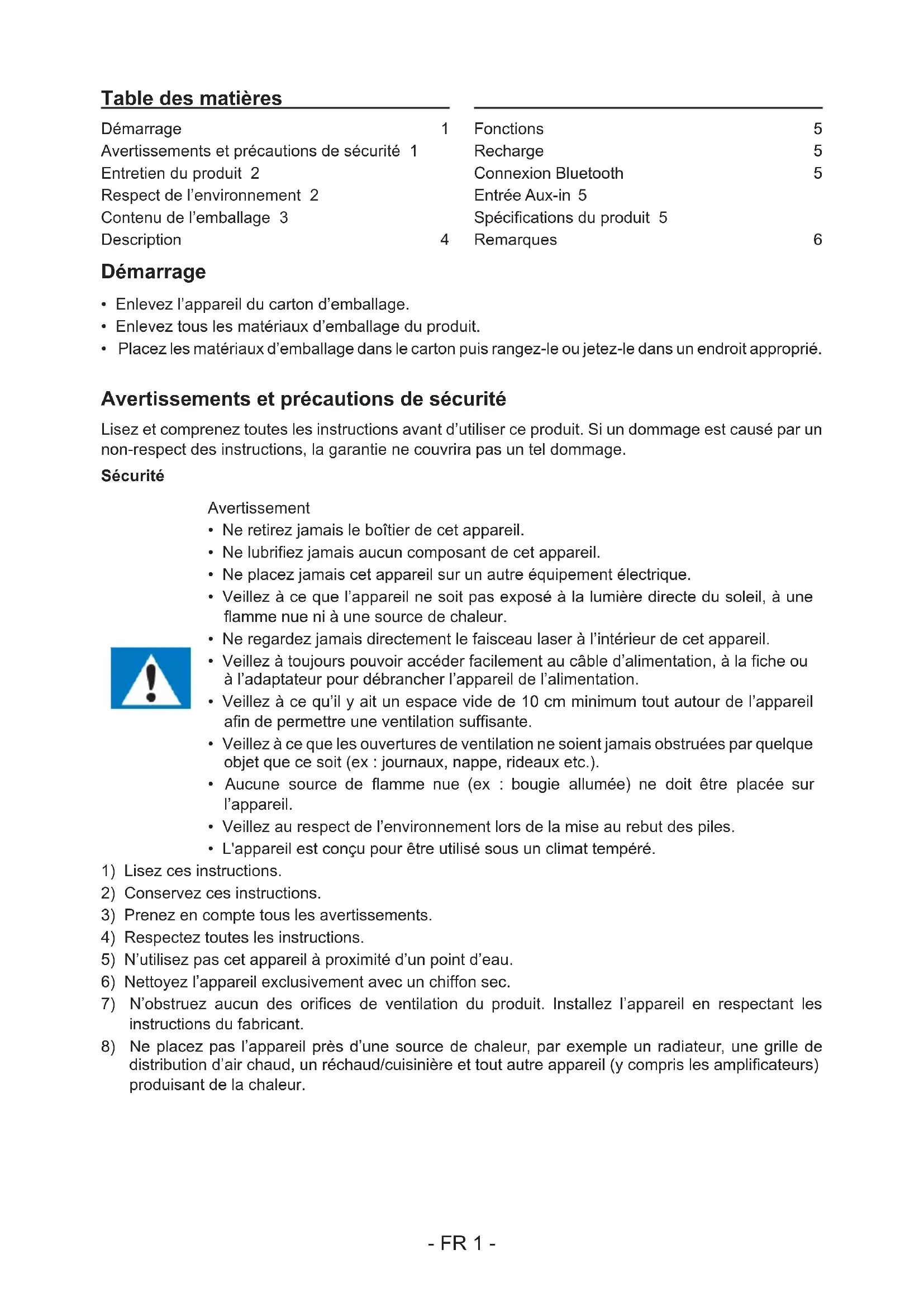distribution d’air chaud, un réchaud/cuisinière et tout autre appareil (y compris les amplicateurs) produisant de la chaleur. Table des matières Démarrage 1 Avertissements et précautions de sécurité 1 Entretien du produit 2 Respect de l’environnement 2 Contenu de l’emballage 3 Description 4 Fonctions : 5 Recharge : 5 Connexion Bluetooth : 5 Entrée Aux-in 5 Spécications du produit 5 Remarques: 6- FR 2 -