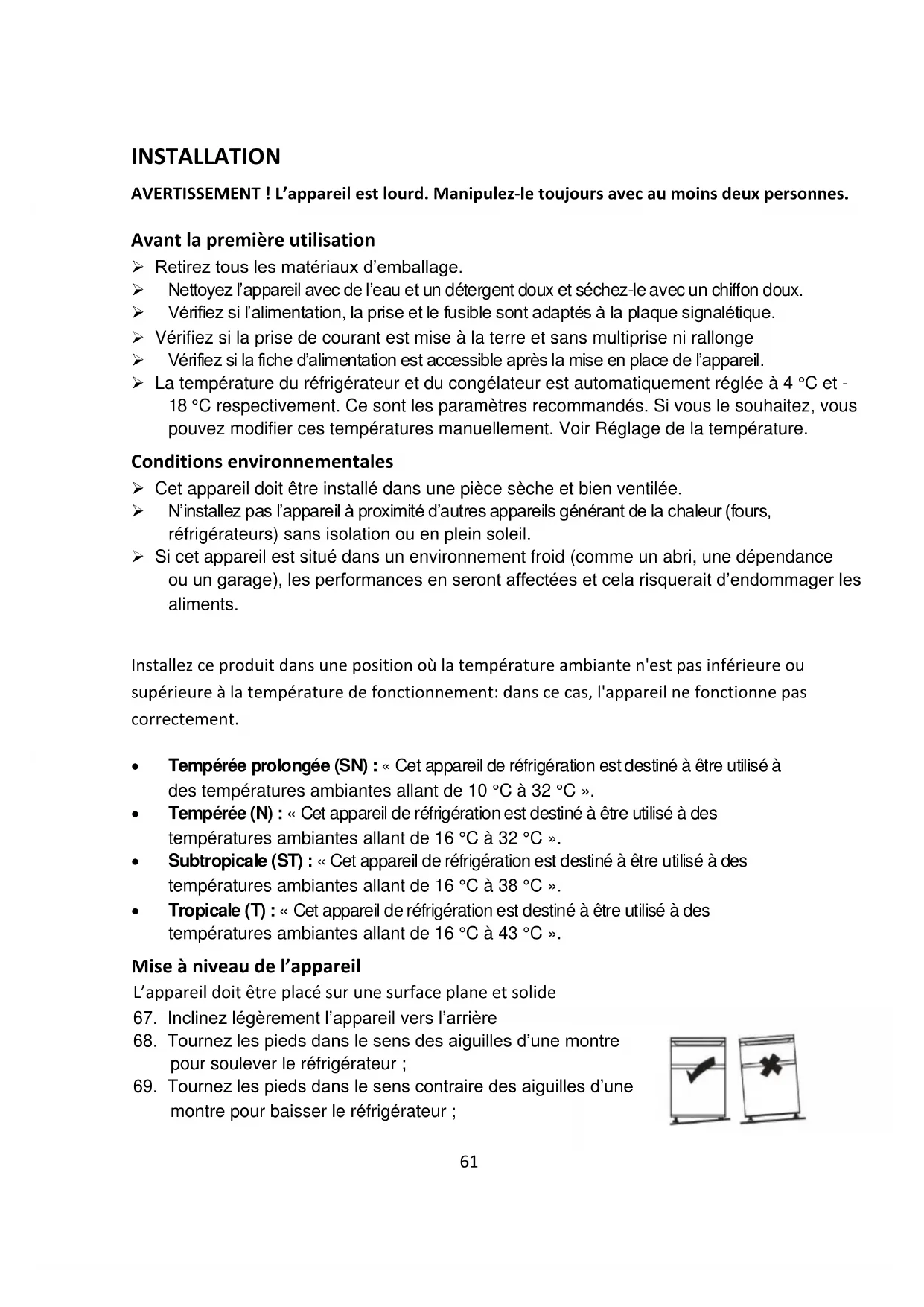 - Tropicale (T) : « Cet appareil de réfrigération est destiné à être utilisé à des températures ambiantes allant de 16 °C à 43 °C ». Mise à niveau de l’appareil L’appareil doit être placé sur une surface plane et solide
