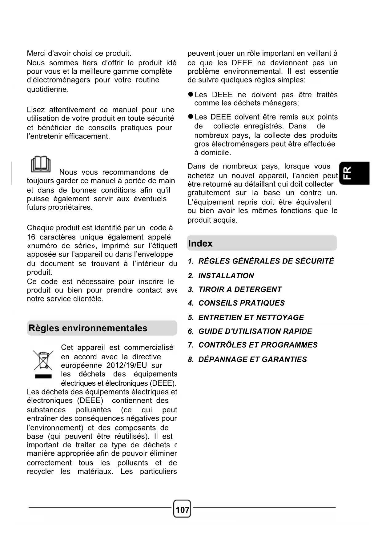 peuvent jouer un rôle important en veillant à ce que les DEEE ne deviennent pas un problème environnemental. Il est essentiel de suivre quelques règles simples: ! Les DEEE ne doivent pas être traités comme les déchets ménagers; ! Les DEEE doivent être remis aux points de collecte enregistrés. Dans de nombreux pays, la collecte des produits gros électroménagers peut être effectuée à domicile. Dans de nombreux pays, lorsque vous achetez un nouvel appareil, l’ancien peut être retourné au détaillant qui doit collecter gratuitement sur la base un contre un. L’équipement repris doit être équivalent ou bien avoir les mêmes fonctions que le produit acquis.