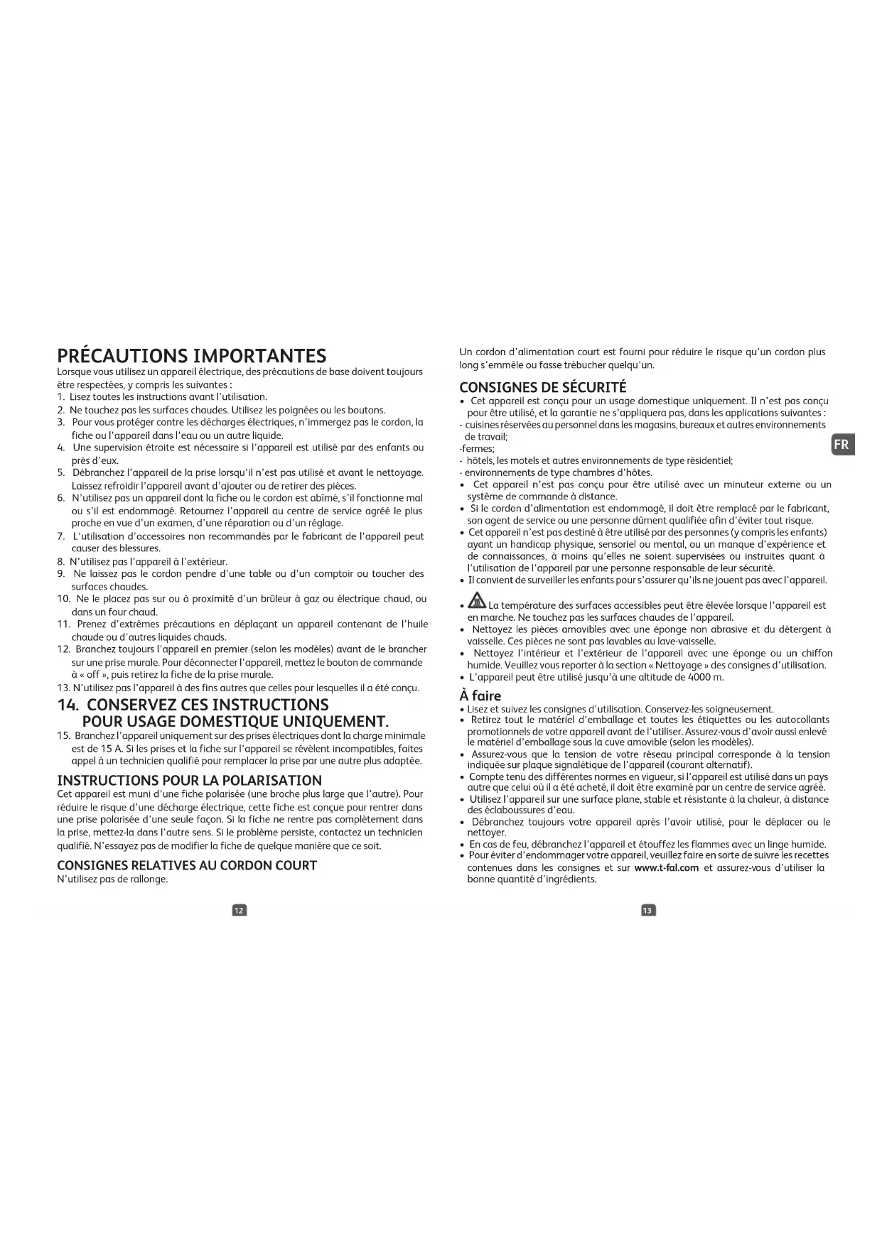 - Lisez et suivez les consignes d’utilisation. Conservez-les soigneusement.• Retirez tout le matériel d’emballage et toutes les étiquettes ou les autocollants promotionnels de votre appareil avant de l’utiliser. Assurez-vous d’avoir aussi enlevé le matériel d’emballage sous la cuve amovible (selon les modèles).• Assurez-vous que la tension de votre réseau principal corresponde à la tension indiquée sur plaque signalétique de l’appareil (courant alternatif).• Compte tenu des différentes normes en vigueur, si l’appareil est utilisé dans un pays autre que celui où il a été acheté, il doit être examiné par un centre de service agréé.• Utilisez l’appareil sur une surface plane, stable et résistante à la chaleur, à distance des éclaboussures d’eau.• Débranchez toujours votre appareil après l’avoir utilisé, pour le déplacer ou le nettoyer.• En cas de feu, débranchez l’appareil et étouffez les flammes avec un linge humide.• Pour éviter d’endommager votre appareil, veuillez faire en sorte de suivre les recettes contenues dans les consignes et sur www.t-fal.com et assurez-vous d’utiliser la bonne quantité d’ingrédients.
