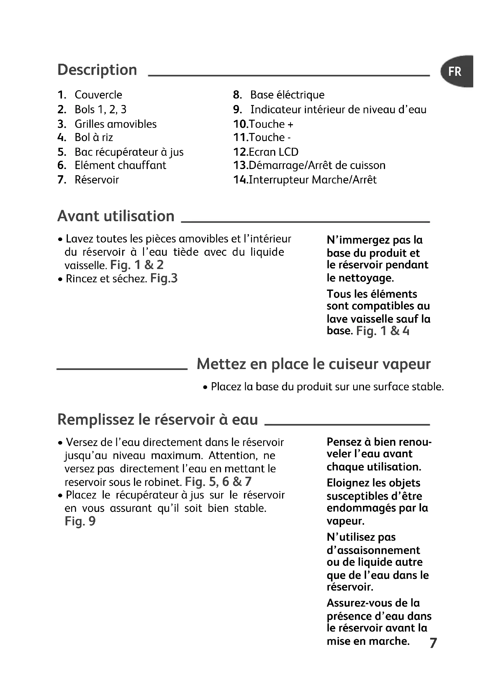 - Placez le récupérateur à jus sur le réservoir en vous assurant qu’il soit bien stable. Fig. 9 N’immergez pas la base du produit et le réservoir pendant le nettoyage. Tous les éléments sont compatibles au lave vaisselle sauf la base. Fig. 1 & 4 Pensez à bien renou- veler l’eau avant chaque utilisation. Eloignez les objets susceptibles d’être endommagés par la vapeur. N’utilisez pas d’assaisonnement ou de liquide autre que de l’eau dans le réservoir. Assurez-vous de la présence d’eau dans le réservoir avant la mise en marche.