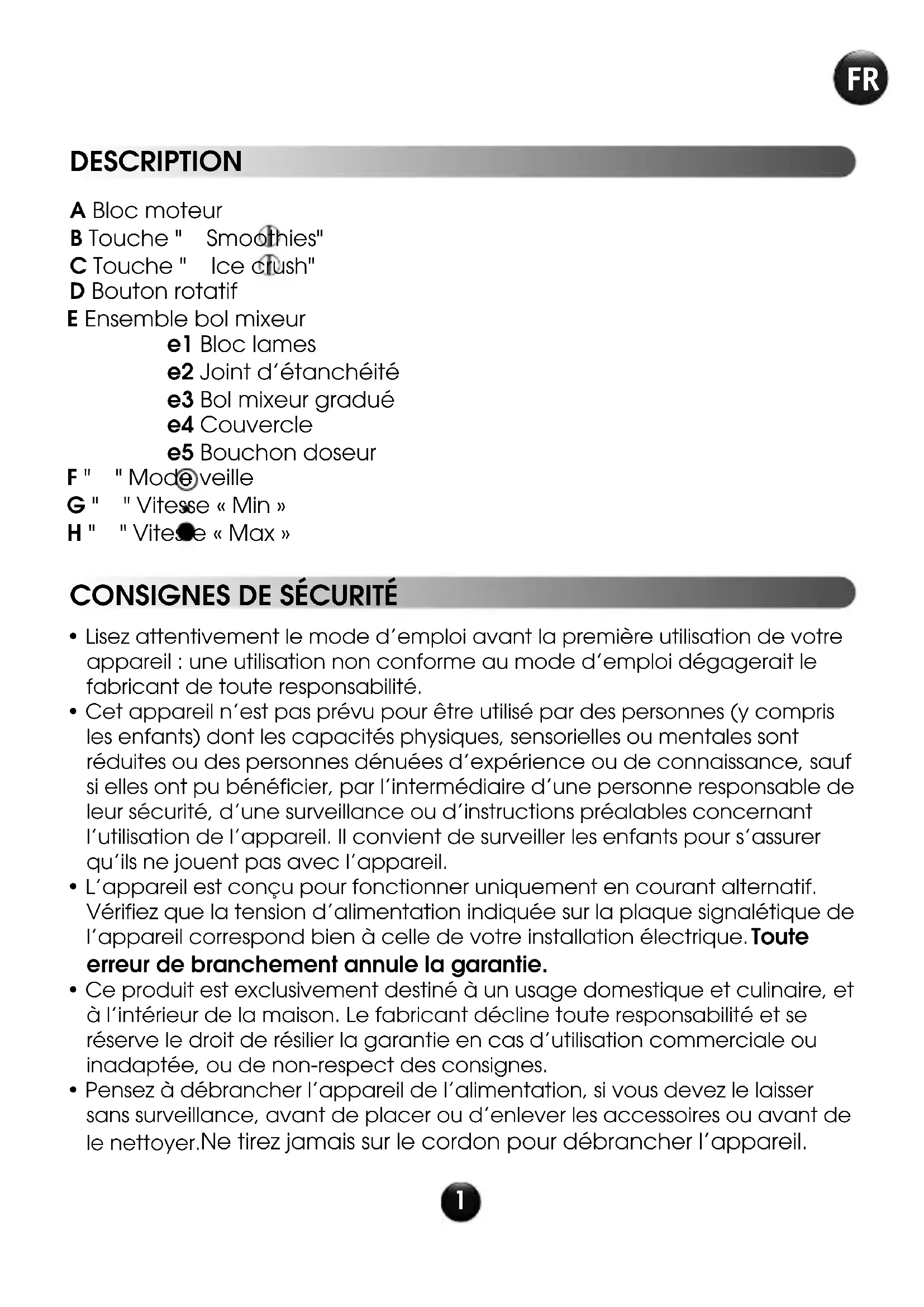 A Bloc moteur B Touche " Smoothies" C Touche " Ice crush" D Bouton rotatif E Ensemble bol mixeur e1 Bloc lames e2 Joint d’étanchéité e3 Bol mixeur gradué e4 Couvercle e5 Bouchon doseur F " " Mode veille G " " Vitesse « Min » H " " Vitesse « Max »
