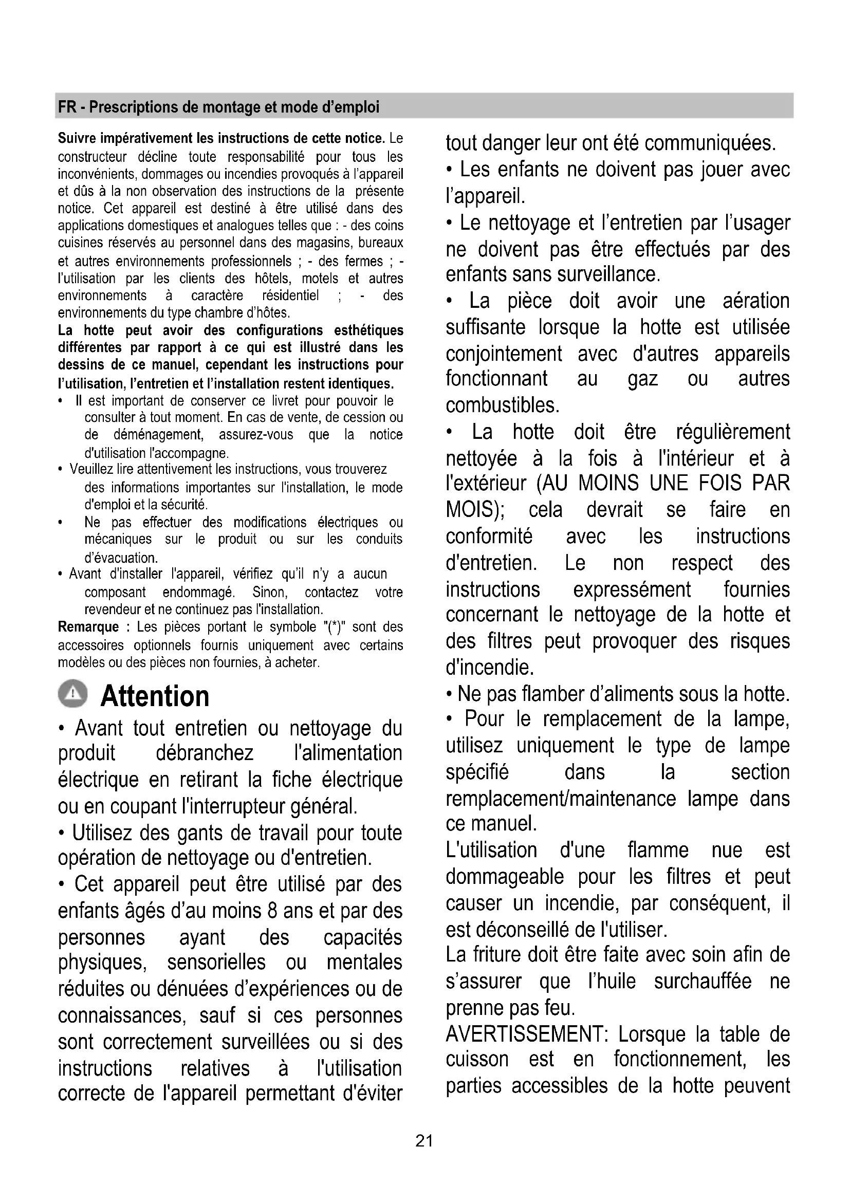 - La hotte doit être régulièrement nettoyée à la fois à l'intérieur et à l'extérieur (AU MOINS UNE FOIS PAR MOIS); cela devrait se faire en conformité avec les instructions d'entretien. Le non respect des instructions expressément fournies concernant le nettoyage de la hotte et des filtres peut provoquer des risques d'incendie.