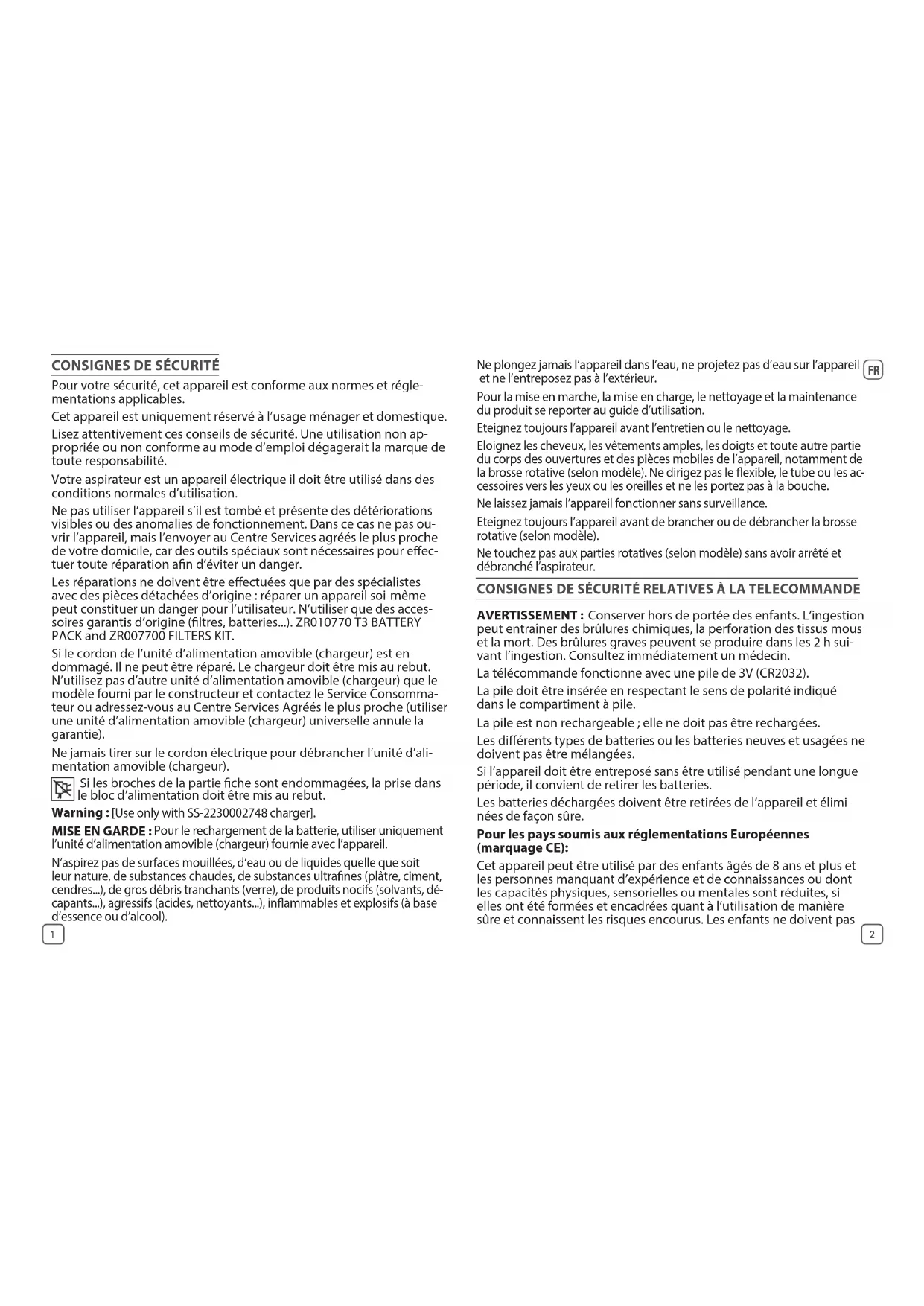 [Use only with SS-2230002748 charger]. MISE EN GARDE : Pour le rechargement de la batterie, utiliser uniquement l’unité d’alimentation amovible (chargeur) fournie avec l’appareil. N’aspirez pas de surfaces mouillées, d’eau ou de liquides quelle que soit leur nature, de substances chaudes, de substances ultranes (plâtre, ciment, cendres...), de gros débris tranchants (verre), de produits nocifs (solvants, dé