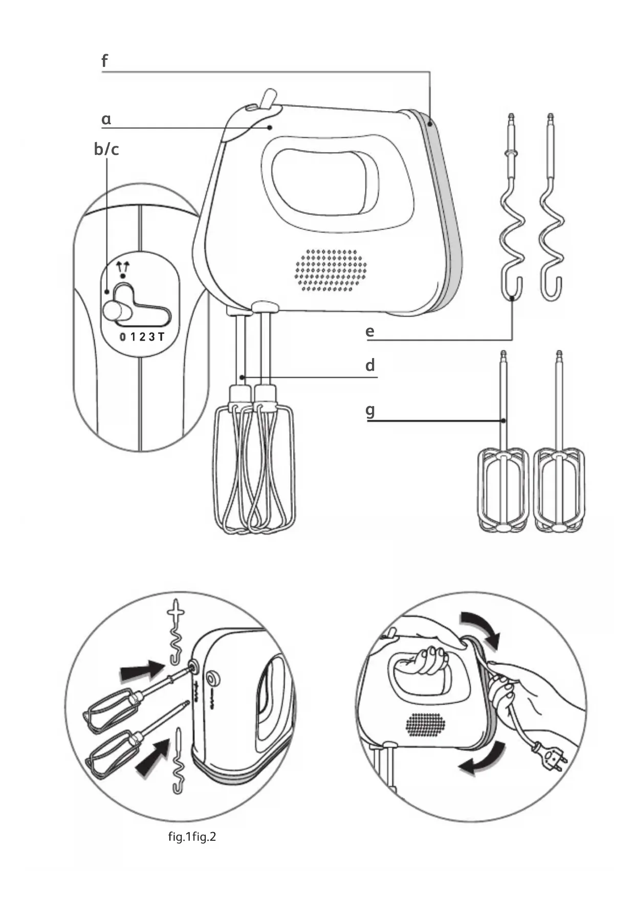 123T Description Mise en service Sortez les accessoires de leur emballage et nettoyez-les à l’eau chaude. Utilisation de l’appareil 1 . Vérifiez que le sélecteur de vitesse (b) est en position « 0 » 2 . Introduisez les fouets (d) ou les malaxeurs (e) dans les orifices prévus à cet effet et verrouillez (Fig.1). Les fouets et les malaxeurs doivent être mis en place suivant la Fig.1. Les deux fouets doivent avoir la même longueur. Ils sont correctement fixés et insérés lorsque vous entendrez un «clic ».