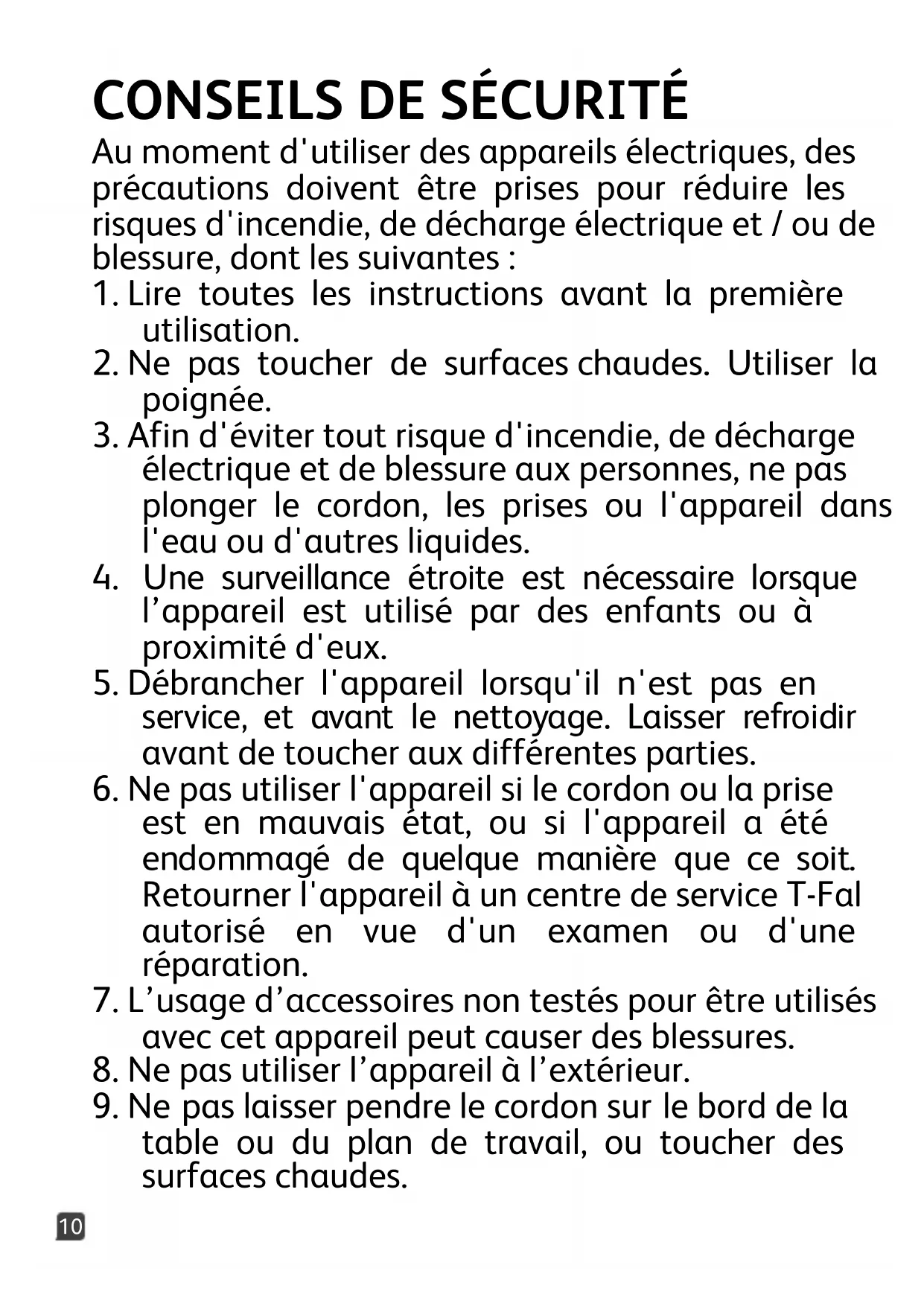 ATTENTION Cet appareil est conçu pour une utilisation domestique seulement. Tout entretienautre que le nettoyage et le détartrage effectués en conformité avec les instructionsdoit être fait par le personnel d’un centre de service agréé T-fal. Visiter notre site Webwww.t-fal.caau Canada ou communiquer avec le service à la clientèle pour obtenir lescoordonnées du centre de service le plus près de chez vous. Afin de réduire les risquesd’incendie et de décharge électrique, ne pas démonter l’appareil. Toute réparationdoit être effectuée par le personnel d’un centre de service agréé T-fal uniquement.