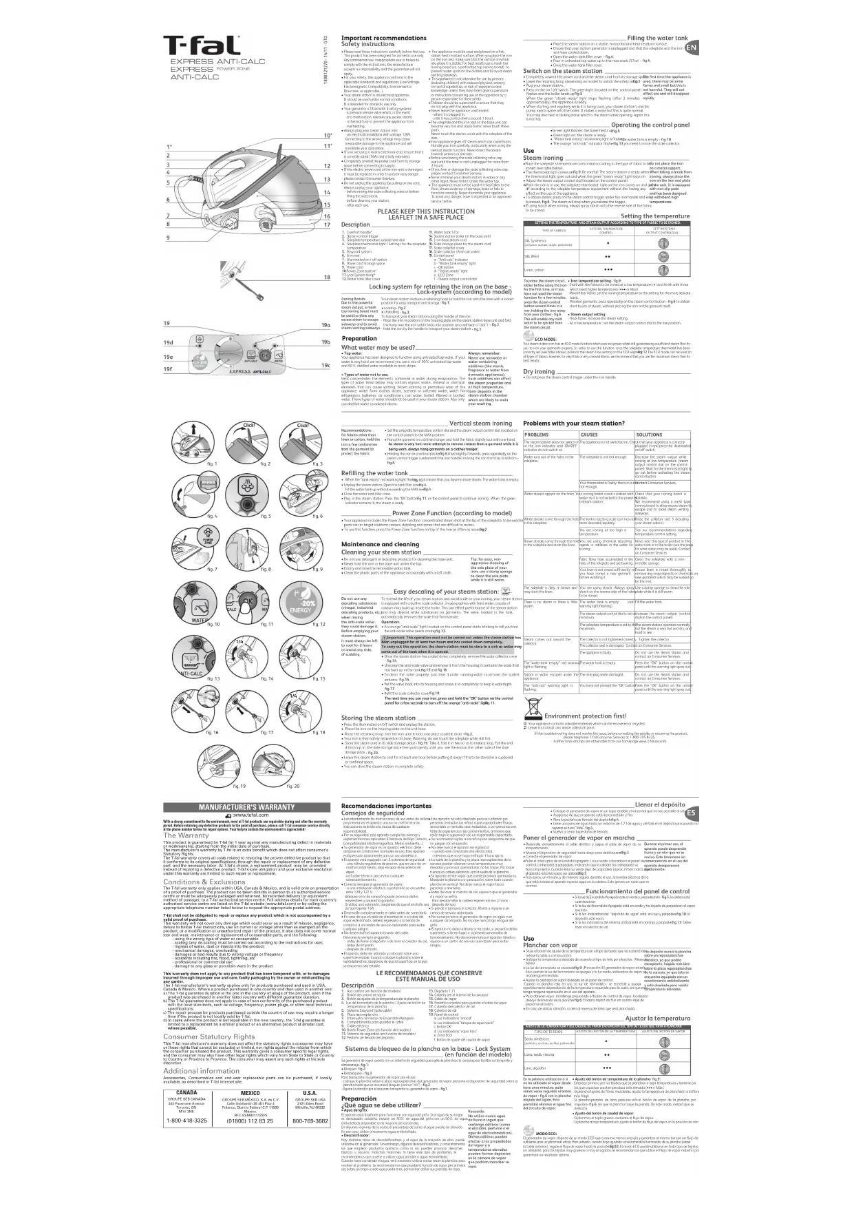XPRESS ANTI-CALC EXPRESS POWER ZONE ANTI-CALC GARANTIE FABRICANT :www.tefal.com Dans le cadre de notre engagement puissant envers l’environnement, la plupart des produits T-fal sont réparablesdurant la période de garantie et par la suite. Avant de retourner des produits défectueux à l’endroit où vous l’avez acheté, veuillez communiquer directement avec le service à la clientèle de T-fal au numéro de téléphone mentionné ci-dessous, pour connaître les options de réparation. Votre aide pour soutenir l’environnement est appréciée! La garantie