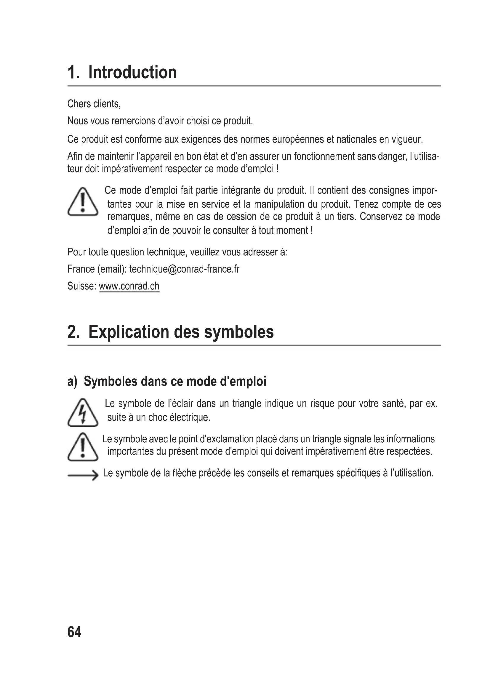 Chers clients, Nous vous remercions d’avoir choisi ce produit. Ce produit est conforme aux exigences des normes européennes et nationales en vigueur. An de maintenir l’appareil en bon état et d’en assurer un fonctionnement sans danger, l’utilisa- teur doit impérativement respecter ce mode d’emploi ! Ce mode d’emploi fait partie intégrante du produit. Il contient des consignes impor- tantes pour la mise en service et la manipulation du produit. Tenez compte de ces remarques, même en cas de cession de ce produit à un tiers. Conservez ce mode d’emploi an de pouvoir le consulter à tout moment ! Pour toute question technique, veuillez vous adresser à: France (email): technique@conrad-france.fr Suisse: www.conrad.ch