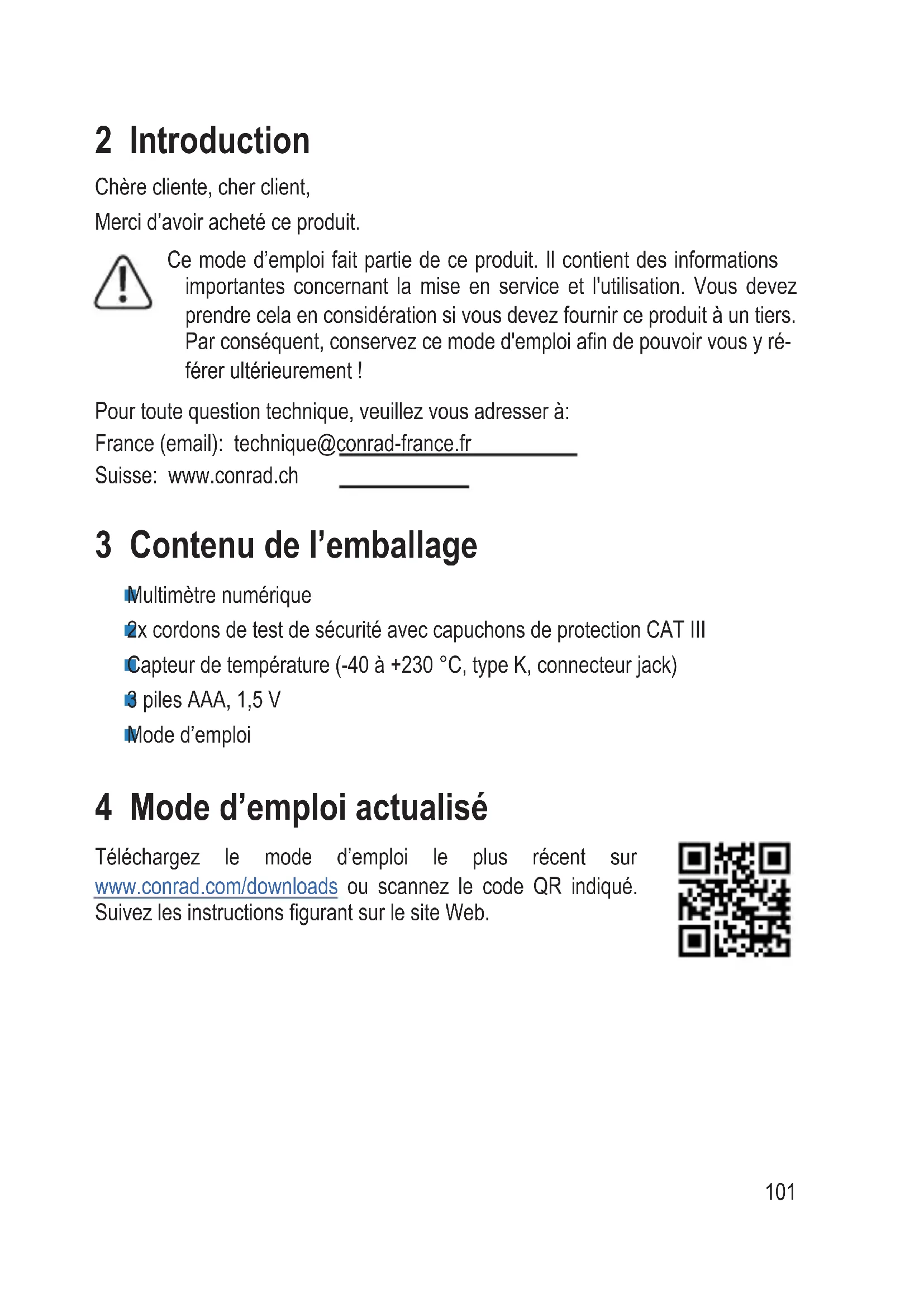 16 Dysfonctionnements ..................................................................................139 17 Caractéristiques techniques ......................................................................140101 2 Introduction Chère cliente, cher client, Merci d’avoir acheté ce produit. Ce mode d’emploi fait partie de ce produit. Il contient des informations importantes concernant la mise en service et l'utilisation. Vous devez prendre cela en considération si vous devez fournir ce produit à un tiers. Par conséquent, conservez ce mode d'emploi an de pouvoir vous y ré- férer ultérieurement ! Pour toute question technique, veuillez vous adresser à: France (email): technique@conrad-france.fr Suisse: www.conrad.ch 3 Contenu de l’emballage
