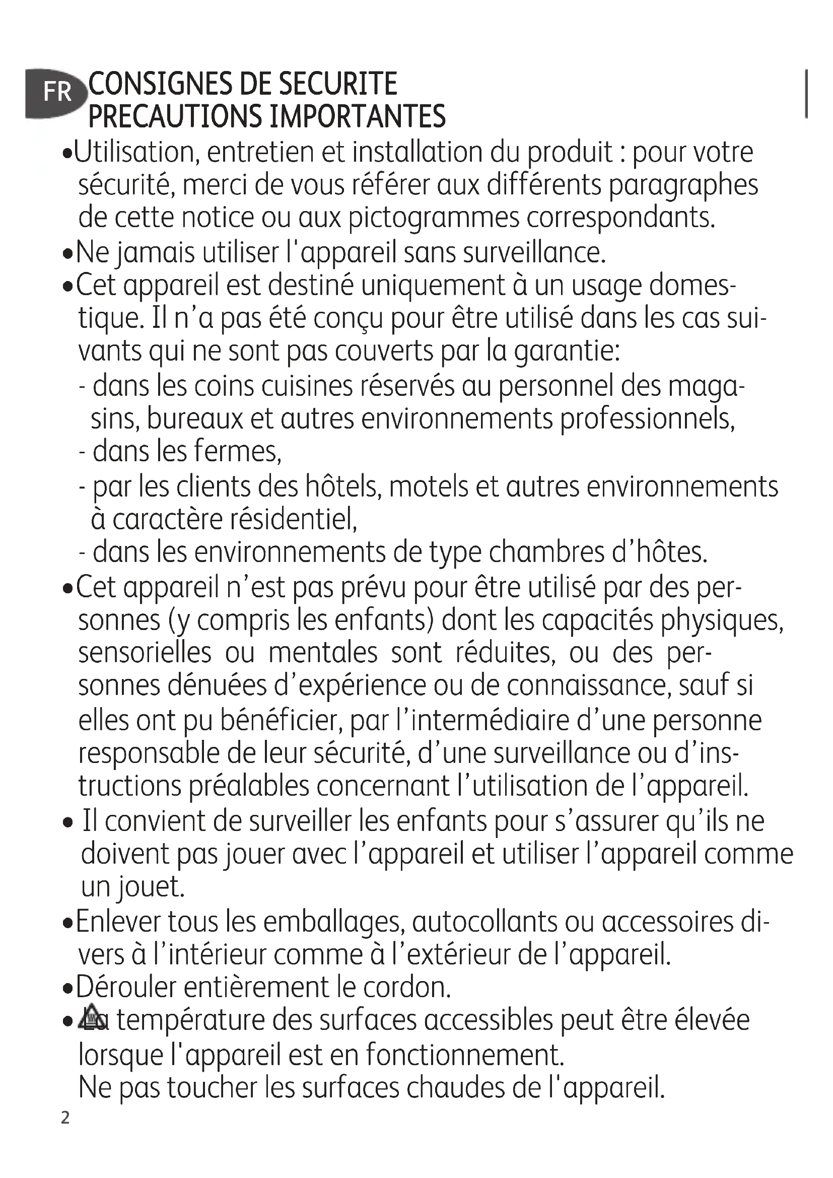 - Cet appareil est destiné uniquement à un usage domes- tique. Il n’a pas été conçu pour être utilisé dans les cas sui- vants qui ne sont pas couverts par la garantie: - dans les coins cuisines réservés au personnel des maga- sins, bureaux et autres environnements professionnels, - dans les fermes, - par les clients des hôtels, motels et autres environnements à caractère résidentiel, - dans les environnements de type chambres d’hôtes.